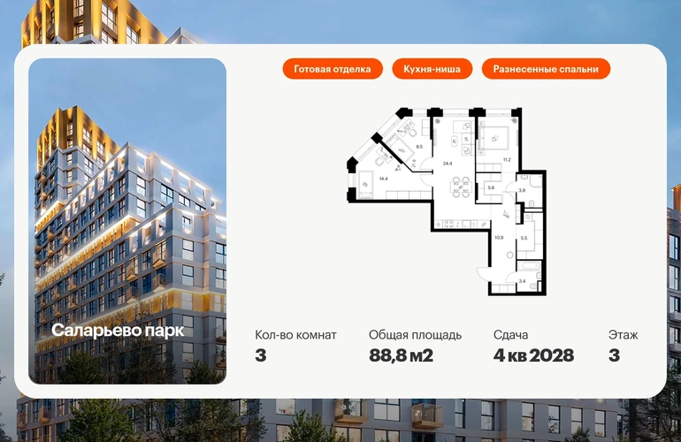 Продаётся 3-комн.квартира площадью 88.80 кв.м на 3 этаже 24 этажного дома (Корпус 82.8, секция 8) проекта ПИК Саларьево парк. Светлый просторный подъезд на уровне земли, функциональная планировка, большие окна, с отделкой. Жилой район «Саларьево парк» расположен в Новой Москве, в четырёх километрах от МКАД по Киевскому шоссе. Две станции метро: «Саларьево» и «Филатов луг», — находятся в пешей доступности от проекта. Дойти до них можно за 5–10 минут. В квартале уже создана качественная среда, где есть абсолютно всё для полноценной жизни, работы и отдыха. «Саларьево парк» — не просто квартал, а полноценный жилой район, который отличается разноплановой архитектурой. Над концепцией квартала работали несколько ведущих архитектурных бюро, которые стремились добиться разнообразия в фасадных решениях. Ярким примером такого подхода станут корпуса 82 и 83, которые относятся к «Серии плюс». Новый корпус 83 был создан по принципам южной архитектуры: расслабленный и лаконичный силуэт зданий, привлекающий к себе внимание. Архитектурная изюминка 83-го корпуса — террасы и фигурные балконы. Вместе с окнами и другими акцентными элементами они создают уникальный облик здания, отсылая нас к изысканной южной архитектуре. Все корпуса в квартале гармонично сочетаются, образуя единую городскую среду. Здесь приятно гулять и проводить время на улице всей семьёй. В «Саларьево парке» создана уникальная образовательная среда, включающая в себя шесть школ, рассчитанных на 6 250 учеников. Четыре из них уже открыты, их посещает 2 300 детей. Также на территории «Саларьево парка» находится 12 детских садов, один из которых с бассейном. Сейчас уже открыты 8 садов. В «Саларьево парке» открыта уникальная игровая площадка — PlayHub «Оригами». Здесь есть ручей, горка-труба и рельефные холмы. Взрослые смогут отдохнуть в уютном кафе, пока дети играют. Также на территории проекта есть SportHub — большая спортивная зона, разделённая по интересам и возрастам. Здесь можно заниматься разными видами спорта: футболом, баскетболом, волейболом и стритболом. Зимой центральную часть площадки превращают в каток. Во дворах-парках жилого квартала есть места для отдыха, детские и спортивные площадки. На первых этажах домов расположены магазины, кафе и полезные сервисы. Также вблизи проекта есть несколько масштабных торговых центров. До ТЦ «Саларис» пять минут пешком, до «Рио», Metro Cash & Carry и «Леруа Мерлен» — пять минут на автомобиле. Артикул - 1033138О застройщике