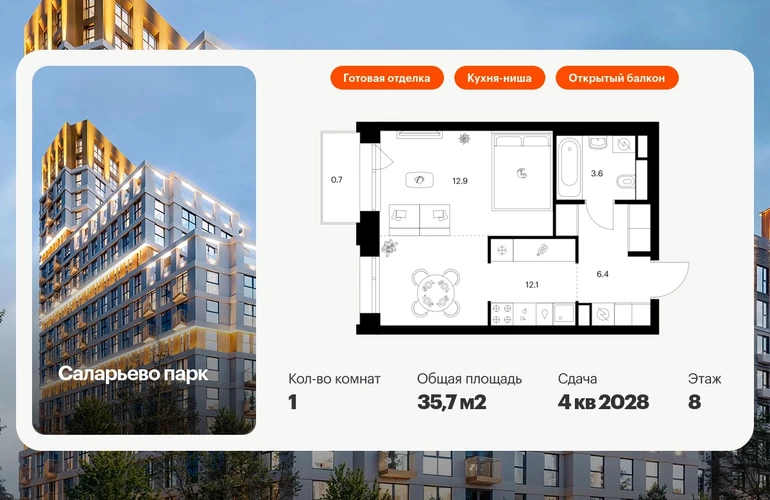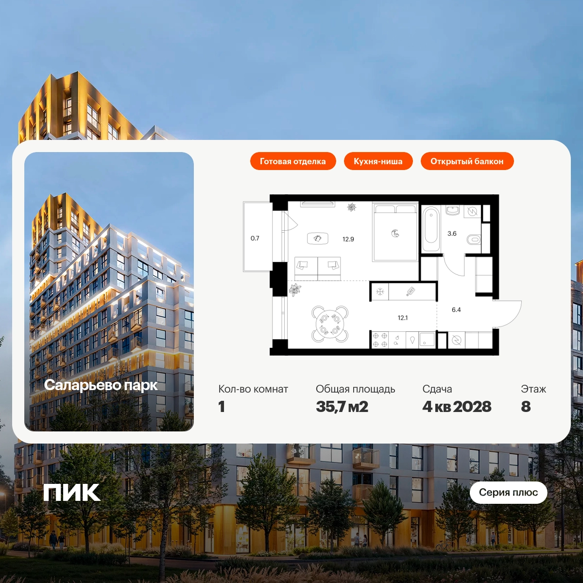 Продаётся 1-комн.квартира площадью 35.70 кв.м на 8 этаже 24 этажного дома (Корпус 82.8, секция 8) проекта ПИК Саларьево парк. Светлый просторный подъезд на уровне земли, функциональная планировка, большие окна, с отделкой. Жилой район «Саларьево парк» расположен в Новой Москве, в четырёх километрах от МКАД по Киевскому шоссе. Две станции метро: «Саларьево» и «Филатов луг», — находятся в пешей доступности от проекта. Дойти до них можно за 5–10 минут. В квартале уже создана качественная среда, где есть абсолютно всё для полноценной жизни, работы и отдыха. «Саларьево парк» — не просто квартал, а полноценный жилой район, который отличается разноплановой архитектурой. Над концепцией квартала работали несколько ведущих архитектурных бюро, которые стремились добиться разнообразия в фасадных решениях. Ярким примером такого подхода станут корпуса 82 и 83, которые относятся к «Серии плюс». Новый корпус 83 был создан по принципам южной архитектуры: расслабленный и лаконичный силуэт зданий, привлекающий к себе внимание. Архитектурная изюминка 83-го корпуса — террасы и фигурные балконы. Вместе с окнами и другими акцентными элементами они создают уникальный облик здания, отсылая нас к изысканной южной архитектуре. Все корпуса в квартале гармонично сочетаются, образуя единую городскую среду. Здесь приятно гулять и проводить время на улице всей семьёй. В «Саларьево парке» создана уникальная образовательная среда, включающая в себя шесть школ, рассчитанных на 6 250 учеников. Четыре из них уже открыты, их посещает 2 300 детей. Также на территории «Саларьево парка» находится 12 детских садов, один из которых с бассейном. Сейчас уже открыты 8 садов. В «Саларьево парке» открыта уникальная игровая площадка — PlayHub «Оригами». Здесь есть ручей, горка-труба и рельефные холмы. Взрослые смогут отдохнуть в уютном кафе, пока дети играют. Также на территории проекта есть SportHub — большая спортивная зона, разделённая по интересам и возрастам. Здесь можно заниматься разными видами спорта: футболом, баскетболом, волейболом и стритболом. Зимой центральную часть площадки превращают в каток. Во дворах-парках жилого квартала есть места для отдыха, детские и спортивные площадки. На первых этажах домов расположены магазины, кафе и полезные сервисы. Также вблизи проекта есть несколько масштабных торговых центров. До ТЦ «Саларис» пять минут пешком, до «Рио», Metro Cash & Carry и «Леруа Мерлен» — пять минут на автомобиле. Артикул - 1033211О застройщике