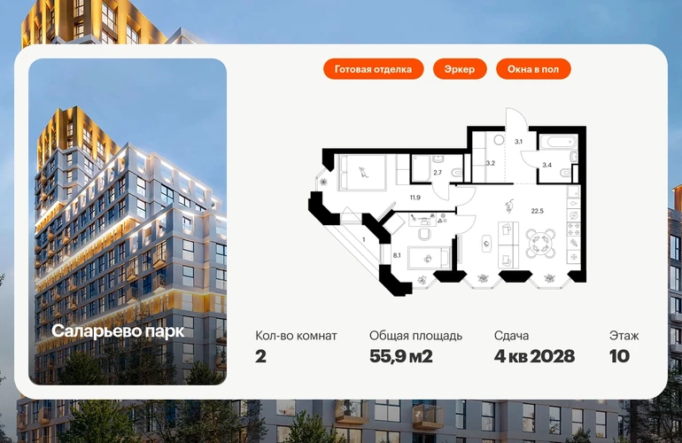 Продаётся 2-комн.квартира площадью 55.90 кв.м на 10 этаже 24 этажного дома (Корпус 82.8, секция 8) проекта ПИК Саларьево парк. Светлый просторный подъезд на уровне земли, функциональная планировка, большие окна, с отделкой. Жилой район «Саларьево парк» расположен в Новой Москве, в четырёх километрах от МКАД по Киевскому шоссе. Две станции метро: «Саларьево» и «Филатов луг», — находятся в пешей доступности от проекта. Дойти до них можно за 5–10 минут. В квартале уже создана качественная среда, где есть абсолютно всё для полноценной жизни, работы и отдыха. «Саларьево парк» — не просто квартал, а полноценный жилой район, который отличается разноплановой архитектурой. Над концепцией квартала работали несколько ведущих архитектурных бюро, которые стремились добиться разнообразия в фасадных решениях. Ярким примером такого подхода станут корпуса 82 и 83, которые относятся к «Серии плюс». Новый корпус 83 был создан по принципам южной архитектуры: расслабленный и лаконичный силуэт зданий, привлекающий к себе внимание. Архитектурная изюминка 83-го корпуса — террасы и фигурные балконы. Вместе с окнами и другими акцентными элементами они создают уникальный облик здания, отсылая нас к изысканной южной архитектуре. Все корпуса в квартале гармонично сочетаются, образуя единую городскую среду. Здесь приятно гулять и проводить время на улице всей семьёй. В «Саларьево парке» создана уникальная образовательная среда, включающая в себя шесть школ, рассчитанных на 6 250 учеников. Четыре из них уже открыты, их посещает 2 300 детей. Также на территории «Саларьево парка» находится 12 детских садов, один из которых с бассейном. Сейчас уже открыты 8 садов. В «Саларьево парке» открыта уникальная игровая площадка — PlayHub «Оригами». Здесь есть ручей, горка-труба и рельефные холмы. Взрослые смогут отдохнуть в уютном кафе, пока дети играют. Также на территории проекта есть SportHub — большая спортивная зона, разделённая по интересам и возрастам. Здесь можно заниматься разными видами спорта: футболом, баскетболом, волейболом и стритболом. Зимой центральную часть площадки превращают в каток. Во дворах-парках жилого квартала есть места для отдыха, детские и спортивные площадки. На первых этажах домов расположены магазины, кафе и полезные сервисы. Также вблизи проекта есть несколько масштабных торговых центров. До ТЦ «Саларис» пять минут пешком, до «Рио», Metro Cash & Carry и «Леруа Мерлен» — пять минут на автомобиле. Артикул - 1033217О застройщике