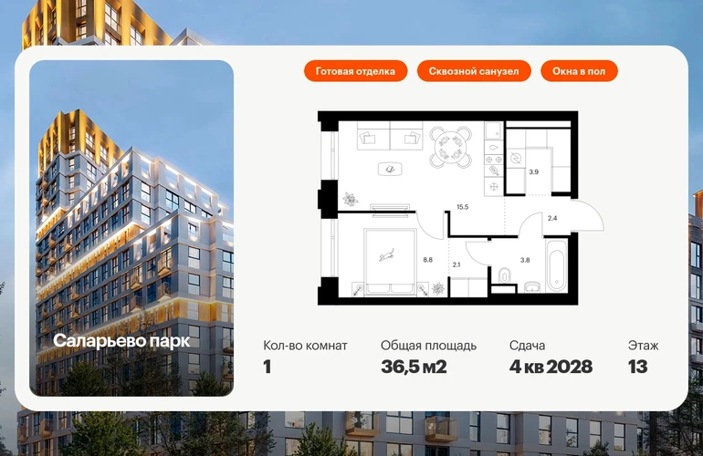 Продаётся 1-комн.квартира площадью 36.50 кв.м на 13 этаже 24 этажного дома (Корпус 82.8, секция 8) проекта ПИК Саларьево парк. Светлый просторный подъезд на уровне земли, функциональная планировка, большие окна, с отделкой. Жилой район «Саларьево парк» расположен в Новой Москве, в четырёх километрах от МКАД по Киевскому шоссе. Две станции метро: «Саларьево» и «Филатов луг», — находятся в пешей доступности от проекта. Дойти до них можно за 5–10 минут. В квартале уже создана качественная среда, где есть абсолютно всё для полноценной жизни, работы и отдыха. «Саларьево парк» — не просто квартал, а полноценный жилой район, который отличается разноплановой архитектурой. Над концепцией квартала работали несколько ведущих архитектурных бюро, которые стремились добиться разнообразия в фасадных решениях. Ярким примером такого подхода станут корпуса 82 и 83, которые относятся к «Серии плюс». Новый корпус 83 был создан по принципам южной архитектуры: расслабленный и лаконичный силуэт зданий, привлекающий к себе внимание. Архитектурная изюминка 83-го корпуса — террасы и фигурные балконы. Вместе с окнами и другими акцентными элементами они создают уникальный облик здания, отсылая нас к изысканной южной архитектуре. Все корпуса в квартале гармонично сочетаются, образуя единую городскую среду. Здесь приятно гулять и проводить время на улице всей семьёй. В «Саларьево парке» создана уникальная образовательная среда, включающая в себя шесть школ, рассчитанных на 6 250 учеников. Четыре из них уже открыты, их посещает 2 300 детей. Также на территории «Саларьево парка» находится 12 детских садов, один из которых с бассейном. Сейчас уже открыты 8 садов. В «Саларьево парке» открыта уникальная игровая площадка — PlayHub «Оригами». Здесь есть ручей, горка-труба и рельефные холмы. Взрослые смогут отдохнуть в уютном кафе, пока дети играют. Также на территории проекта есть SportHub — большая спортивная зона, разделённая по интересам и возрастам. Здесь можно заниматься разными видами спорта: футболом, баскетболом, волейболом и стритболом. Зимой центральную часть площадки превращают в каток. Во дворах-парках жилого квартала есть места для отдыха, детские и спортивные площадки. На первых этажах домов расположены магазины, кафе и полезные сервисы. Также вблизи проекта есть несколько масштабных торговых центров. До ТЦ «Саларис» пять минут пешком, до «Рио», Metro Cash & Carry и «Леруа Мерлен» — пять минут на автомобиле. Артикул - 1033236О застройщике