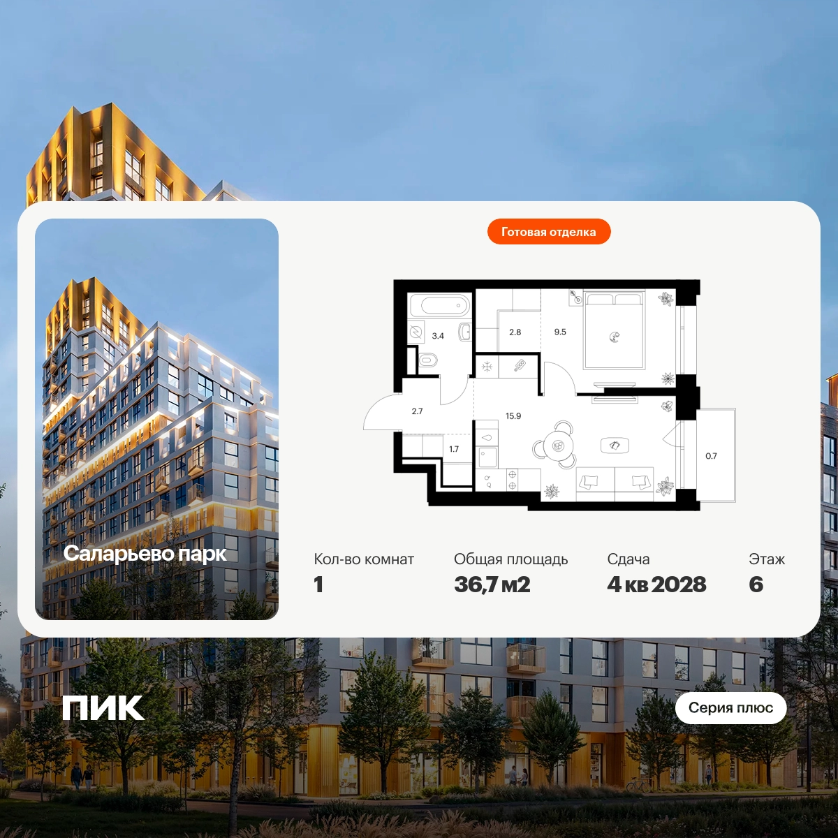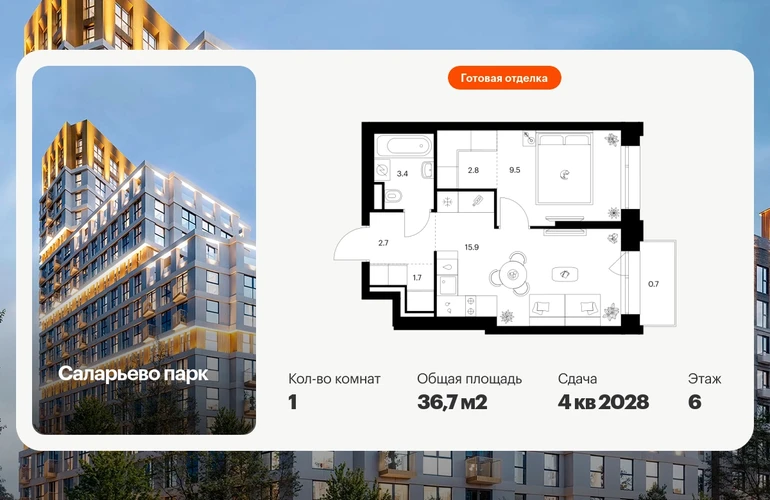 Продаётся 1-комн.квартира площадью 36.70 кв.м на 6 этаже 24 этажного дома (Корпус 82.8, секция 8) проекта ПИК Саларьево парк. Светлый просторный подъезд на уровне земли, функциональная планировка, большие окна, с отделкой. Артикул - 1047883О застройщике