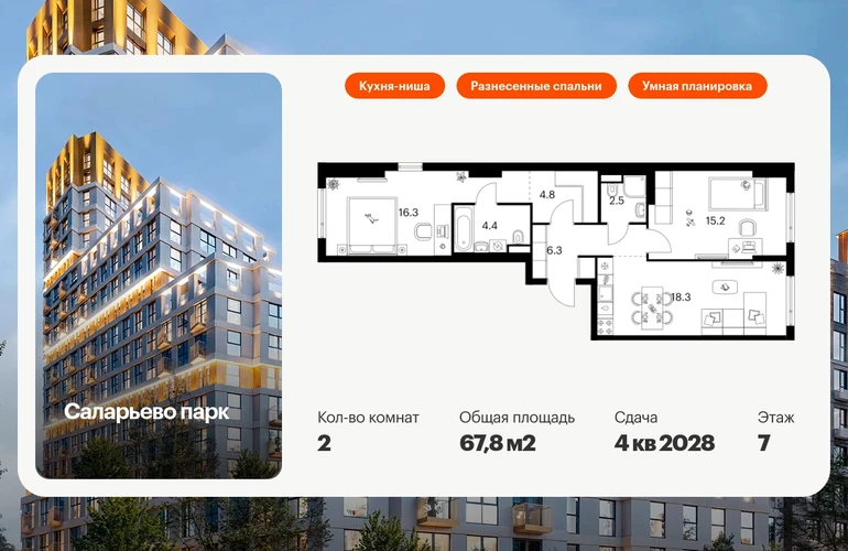Продаётся 2-комн.квартира площадью 67.80 кв.м на 7 этаже 16 этажного дома (Корпус 82.5, секция 5) проекта ПИК Саларьево парк. Светлый просторный подъезд на уровне земли, функциональная планировка, большие окна, с отделкой. Артикул - 1032792О застройщике