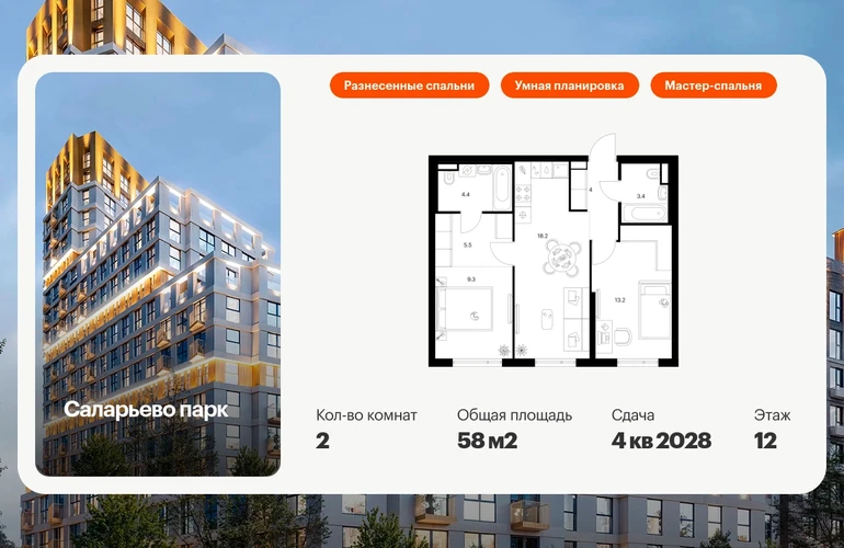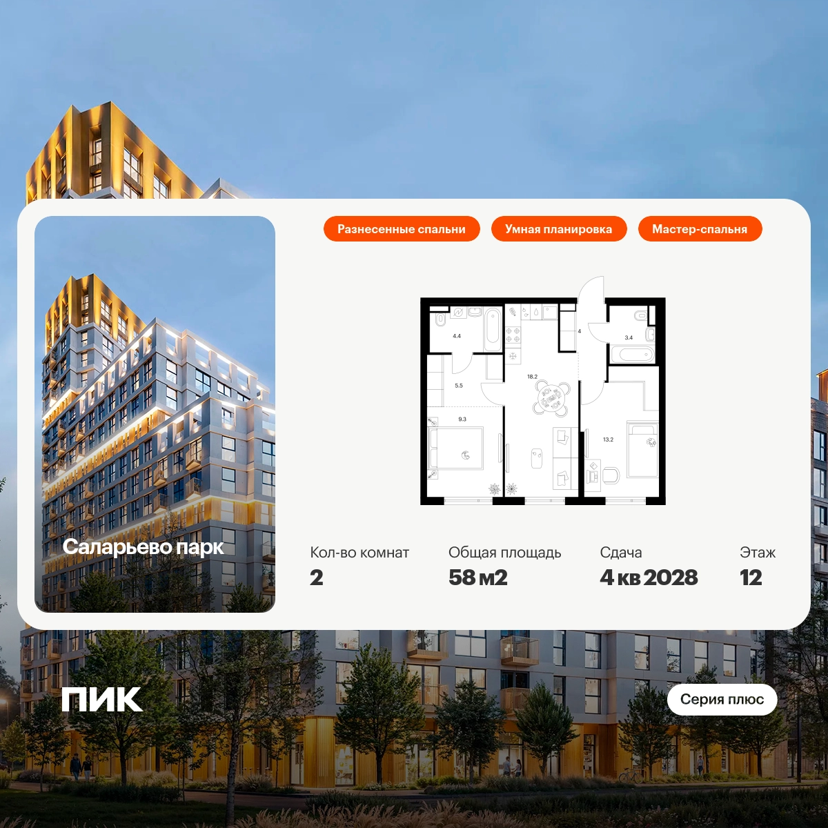 Продаётся 2-комн.квартира площадью 58.00 кв.м на 12 этаже 16 этажного дома (Корпус 82.5, секция 5) проекта ПИК Саларьево парк. Светлый просторный подъезд на уровне земли, функциональная планировка, большие окна, с отделкой. Артикул - 1032825О застройщике
