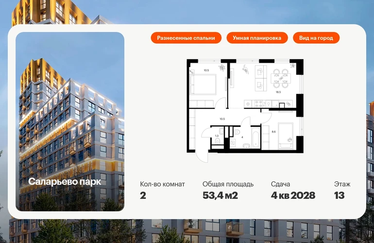 Продаётся 2-комн.квартира площадью 53.40 кв.м на 13 этаже 16 этажного дома (Корпус 82.5, секция 5) проекта ПИК Саларьево парк. Светлый просторный подъезд на уровне земли, функциональная планировка, большие окна, с отделкой. Артикул - 1032826О застройщике