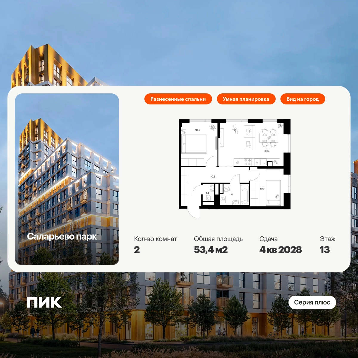 В «Серию плюс» входят жилые кварталы с повышенным уровнем комфорта и уникальной архитектурой. У квартир умные планировки: можно выбрать квартиру с мастер-спальней, где есть отдельная ванная комната, с просторной кухней-гостиной, с двумя санузлами, с гардеробной или постирочной. В светлых уютных лобби с дизайнерской отделкой предусмотрены колясочная и гостевой санузел.
