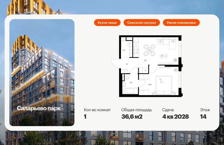 Продаётся 1-комн.квартира площадью 36.60 кв.м на 14 этаже 24 этажного дома (Корпус 82.4, секция 4) проекта ПИК Саларьево парк. Светлый просторный подъезд на уровне земли, функциональная планировка, большие окна, с отделкой. Жилой район «Саларьево парк» расположен в Новой Москве, в четырёх километрах от МКАД по Киевскому шоссе. Две станции метро: «Саларьево» и «Филатов луг», — находятся в пешей доступности от проекта. Дойти до них можно за 5–10 минут. В квартале уже создана качественная среда, где есть абсолютно всё для полноценной жизни, работы и отдыха. «Саларьево парк» — не просто квартал, а полноценный жилой район, который отличается разноплановой архитектурой. Над концепцией квартала работали несколько ведущих архитектурных бюро, которые стремились добиться разнообразия в фасадных решениях. Ярким примером такого подхода станут корпуса 82 и 83, которые относятся к «Серии плюс». Новый корпус 83 был создан по принципам южной архитектуры: расслабленный и лаконичный силуэт зданий, привлекающий к себе внимание. Архитектурная изюминка 83-го корпуса — террасы и фигурные балконы. Вместе с окнами и другими акцентными элементами они создают уникальный облик здания, отсылая нас к изысканной южной архитектуре. Все корпуса в квартале гармонично сочетаются, образуя единую городскую среду. Здесь приятно гулять и проводить время на улице всей семьёй. В «Саларьево парке» создана уникальная образовательная среда, включающая в себя шесть школ, рассчитанных на 6 250 учеников. Четыре из них уже открыты, их посещает 2 300 детей. Также на территории «Саларьево парка» находится 12 детских садов, один из которых с бассейном. Сейчас уже открыты 8 садов. В «Саларьево парке» открыта уникальная игровая площадка — PlayHub «Оригами». Здесь есть ручей, горка-труба и рельефные холмы. Взрослые смогут отдохнуть в уютном кафе, пока дети играют. Также на территории проекта есть SportHub — большая спортивная зона, разделённая по интересам и возрастам. Здесь можно заниматься разными видами спорта: футболом, баскетболом, волейболом и стритболом. Зимой центральную часть площадки превращают в каток. Во дворах-парках жилого квартала есть места для отдыха, детские и спортивные площадки. На первых этажах домов расположены магазины, кафе и полезные сервисы. Также вблизи проекта есть несколько масштабных торговых центров. До ТЦ «Саларис» пять минут пешком, до «Рио», Metro Cash & Carry и «Леруа Мерлен» — пять минут на автомобиле. Артикул - 1032695О застройщике