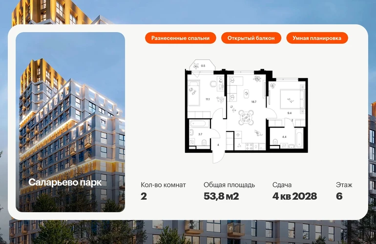 Продаётся 2-комн.квартира площадью 53.80 кв.м на 6 этаже 24 этажного дома (Корпус 82.4, секция 4) проекта ПИК Саларьево парк. Светлый просторный подъезд на уровне земли, функциональная планировка, большие окна, с отделкой. Жилой район «Саларьево парк» расположен в Новой Москве, в четырёх километрах от МКАД по Киевскому шоссе. Две станции метро: «Саларьево» и «Филатов луг», — находятся в пешей доступности от проекта. Дойти до них можно за 5–10 минут. В квартале уже создана качественная среда, где есть абсолютно всё для полноценной жизни, работы и отдыха. «Саларьево парк» — не просто квартал, а полноценный жилой район, который отличается разноплановой архитектурой. Над концепцией квартала работали несколько ведущих архитектурных бюро, которые стремились добиться разнообразия в фасадных решениях. Ярким примером такого подхода станут корпуса 82 и 83, которые относятся к «Серии плюс». Новый корпус 83 был создан по принципам южной архитектуры: расслабленный и лаконичный силуэт зданий, привлекающий к себе внимание. Архитектурная изюминка 83-го корпуса — террасы и фигурные балконы. Вместе с окнами и другими акцентными элементами они создают уникальный облик здания, отсылая нас к изысканной южной архитектуре. Все корпуса в квартале гармонично сочетаются, образуя единую городскую среду. Здесь приятно гулять и проводить время на улице всей семьёй. В «Саларьево парке» создана уникальная образовательная среда, включающая в себя шесть школ, рассчитанных на 6 250 учеников. Четыре из них уже открыты, их посещает 2 300 детей. Также на территории «Саларьево парка» находится 12 детских садов, один из которых с бассейном. Сейчас уже открыты 8 садов. В «Саларьево парке» открыта уникальная игровая площадка — PlayHub «Оригами». Здесь есть ручей, горка-труба и рельефные холмы. Взрослые смогут отдохнуть в уютном кафе, пока дети играют. Также на территории проекта есть SportHub — большая спортивная зона, разделённая по интересам и возрастам. Здесь можно заниматься разными видами спорта: футболом, баскетболом, волейболом и стритболом. Зимой центральную часть площадки превращают в каток. Во дворах-парках жилого квартала есть места для отдыха, детские и спортивные площадки. На первых этажах домов расположены магазины, кафе и полезные сервисы. Также вблизи проекта есть несколько масштабных торговых центров. До ТЦ «Саларис» пять минут пешком, до «Рио», Metro Cash & Carry и «Леруа Мерлен» — пять минут на автомобиле. Артикул - 1032551О застройщике