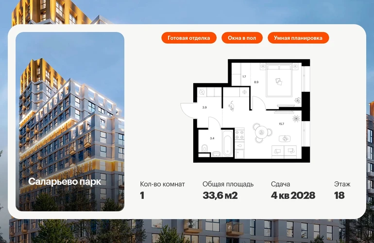 Продаётся 1-комн.квартира площадью 33.60 кв.м на 18 этаже 24 этажного дома (Корпус 82.7, секция 7) проекта ПИК Саларьево парк. Светлый просторный подъезд на уровне земли, функциональная планировка, большие окна, с отделкой. Жилой район «Саларьево парк» расположен в Новой Москве, в четырёх километрах от МКАД по Киевскому шоссе. Две станции метро: «Саларьево» и «Филатов луг», — находятся в пешей доступности от проекта. Дойти до них можно за 5–10 минут. В квартале уже создана качественная среда, где есть абсолютно всё для полноценной жизни, работы и отдыха. «Саларьево парк» — не просто квартал, а полноценный жилой район, который отличается разноплановой архитектурой. Над концепцией квартала работали несколько ведущих архитектурных бюро, которые стремились добиться разнообразия в фасадных решениях. Ярким примером такого подхода станут корпуса 82 и 83, которые относятся к «Серии плюс». Новый корпус 83 был создан по принципам южной архитектуры: расслабленный и лаконичный силуэт зданий, привлекающий к себе внимание. Архитектурная изюминка 83-го корпуса — террасы и фигурные балконы. Вместе с окнами и другими акцентными элементами они создают уникальный облик здания, отсылая нас к изысканной южной архитектуре. Все корпуса в квартале гармонично сочетаются, образуя единую городскую среду. Здесь приятно гулять и проводить время на улице всей семьёй. В «Саларьево парке» создана уникальная образовательная среда, включающая в себя шесть школ, рассчитанных на 6 250 учеников. Четыре из них уже открыты, их посещает 2 300 детей. Также на территории «Саларьево парка» находится 12 детских садов, один из которых с бассейном. Сейчас уже открыты 8 садов. В «Саларьево парке» открыта уникальная игровая площадка — PlayHub «Оригами». Здесь есть ручей, горка-труба и рельефные холмы. Взрослые смогут отдохнуть в уютном кафе, пока дети играют. Также на территории проекта есть SportHub — большая спортивная зона, разделённая по интересам и возрастам. Здесь можно заниматься разными видами спорта: футболом, баскетболом, волейболом и стритболом. Зимой центральную часть площадки превращают в каток. Во дворах-парках жилого квартала есть места для отдыха, детские и спортивные площадки. На первых этажах домов расположены магазины, кафе и полезные сервисы. Также вблизи проекта есть несколько масштабных торговых центров. До ТЦ «Саларис» пять минут пешком, до «Рио», Metro Cash & Carry и «Леруа Мерлен» — пять минут на автомобиле. Артикул - 1033084О застройщике