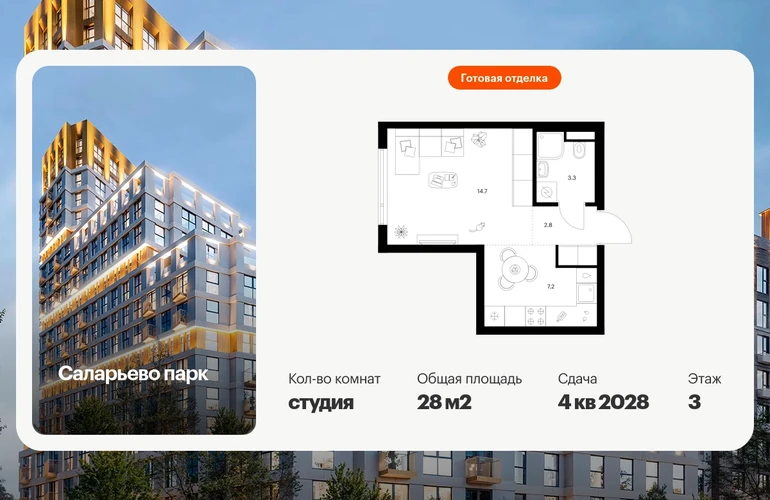 Продаётся квартира-студия площадью 28.00 кв.м на 3 этаже 24 этажного дома (Корпус 82.7, секция 7) проекта ПИК Саларьево парк. Светлый просторный подъезд на уровне земли, функциональная планировка, большие окна, с отделкой. Жилой район «Саларьево парк» расположен в Новой Москве, в четырёх километрах от МКАД по Киевскому шоссе. Две станции метро: «Саларьево» и «Филатов луг», — находятся в пешей доступности от проекта. Дойти до них можно за 5–10 минут. В квартале уже создана качественная среда, где есть абсолютно всё для полноценной жизни, работы и отдыха. «Саларьево парк» — не просто квартал, а полноценный жилой район, который отличается разноплановой архитектурой. Над концепцией квартала работали несколько ведущих архитектурных бюро, которые стремились добиться разнообразия в фасадных решениях. Ярким примером такого подхода станут корпуса 82 и 83, которые относятся к «Серии плюс». Новый корпус 83 был создан по принципам южной архитектуры: расслабленный и лаконичный силуэт зданий, привлекающий к себе внимание. Архитектурная изюминка 83-го корпуса — террасы и фигурные балконы. Вместе с окнами и другими акцентными элементами они создают уникальный облик здания, отсылая нас к изысканной южной архитектуре. Все корпуса в квартале гармонично сочетаются, образуя единую городскую среду. Здесь приятно гулять и проводить время на улице всей семьёй. В «Саларьево парке» создана уникальная образовательная среда, включающая в себя шесть школ, рассчитанных на 6 250 учеников. Четыре из них уже открыты, их посещает 2 300 детей. Также на территории «Саларьево парка» находится 12 детских садов, один из которых с бассейном. Сейчас уже открыты 8 садов. В «Саларьево парке» открыта уникальная игровая площадка — PlayHub «Оригами». Здесь есть ручей, горка-труба и рельефные холмы. Взрослые смогут отдохнуть в уютном кафе, пока дети играют. Также на территории проекта есть SportHub — большая спортивная зона, разделённая по интересам и возрастам. Здесь можно заниматься разными видами спорта: футболом, баскетболом, волейболом и стритболом. Зимой центральную часть площадки превращают в каток. Во дворах-парках жилого квартала есть места для отдыха, детские и спортивные площадки. На первых этажах домов расположены магазины, кафе и полезные сервисы. Также вблизи проекта есть несколько масштабных торговых центров. До ТЦ «Саларис» пять минут пешком, до «Рио», Metro Cash & Carry и «Леруа Мерлен» — пять минут на автомобиле. Артикул - 1047850О застройщике
