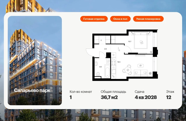 Продаётся 1-комн.квартира площадью 36.70 кв.м на 12 этаже 24 этажного дома (Корпус 82.8, секция 8) проекта ПИК Саларьево парк. Светлый просторный подъезд на уровне земли, функциональная планировка, большие окна, с отделкой. Жилой район «Саларьево парк» расположен в Новой Москве, в четырёх километрах от МКАД по Киевскому шоссе. Две станции метро: «Саларьево» и «Филатов луг», — находятся в пешей доступности от проекта. Дойти до них можно за 5–10 минут. В квартале уже создана качественная среда, где есть абсолютно всё для полноценной жизни, работы и отдыха. «Саларьево парк» — не просто квартал, а полноценный жилой район, который отличается разноплановой архитектурой. Над концепцией квартала работали несколько ведущих архитектурных бюро, которые стремились добиться разнообразия в фасадных решениях. Ярким примером такого подхода станут корпуса 82 и 83, которые относятся к «Серии плюс». Новый корпус 83 был создан по принципам южной архитектуры: расслабленный и лаконичный силуэт зданий, привлекающий к себе внимание. Архитектурная изюминка 83-го корпуса — террасы и фигурные балконы. Вместе с окнами и другими акцентными элементами они создают уникальный облик здания, отсылая нас к изысканной южной архитектуре. Все корпуса в квартале гармонично сочетаются, образуя единую городскую среду. Здесь приятно гулять и проводить время на улице всей семьёй. В «Саларьево парке» создана уникальная образовательная среда, включающая в себя шесть школ, рассчитанных на 6 250 учеников. Четыре из них уже открыты, их посещает 2 300 детей. Также на территории «Саларьево парка» находится 12 детских садов, один из которых с бассейном. Сейчас уже открыты 8 садов. В «Саларьево парке» открыта уникальная игровая площадка — PlayHub «Оригами». Здесь есть ручей, горка-труба и рельефные холмы. Взрослые смогут отдохнуть в уютном кафе, пока дети играют. Также на территории проекта есть SportHub — большая спортивная зона, разделённая по интересам и возрастам. Здесь можно заниматься разными видами спорта: футболом, баскетболом, волейболом и стритболом. Зимой центральную часть площадки превращают в каток. Во дворах-парках жилого квартала есть места для отдыха, детские и спортивные площадки. На первых этажах домов расположены магазины, кафе и полезные сервисы. Также вблизи проекта есть несколько масштабных торговых центров. До ТЦ «Саларис» пять минут пешком, до «Рио», Metro Cash & Carry и «Леруа Мерлен» — пять минут на автомобиле. Артикул - 1033234О застройщике