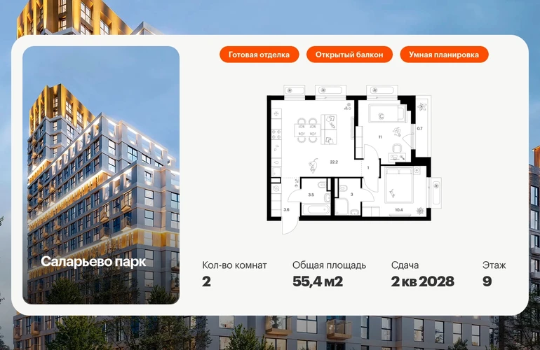 Продаётся 2-комн.квартира площадью 55.40 кв.м на 9 этаже 18 этажного дома (Корпус 74.9, секция 9) проекта ПИК Саларьево парк. Светлый просторный подъезд на уровне земли, функциональная планировка, большие окна, с отделкой. Жилой район «Саларьево парк» расположен в Новой Москве, в четырёх километрах от МКАД по Киевскому шоссе. Две станции метро: «Саларьево» и «Филатов луг», — находятся в пешей доступности от проекта. Дойти до них можно за 5–10 минут. В квартале уже создана качественная среда, где есть абсолютно всё для полноценной жизни, работы и отдыха. «Саларьево парк» — не просто квартал, а полноценный жилой район, который отличается разноплановой архитектурой. Над концепцией квартала работали несколько ведущих архитектурных бюро, которые стремились добиться разнообразия в фасадных решениях. Ярким примером такого подхода станут корпуса 82 и 83, которые относятся к «Серии плюс». Новый корпус 83 был создан по принципам южной архитектуры: расслабленный и лаконичный силуэт зданий, привлекающий к себе внимание. Архитектурная изюминка 83-го корпуса — террасы и фигурные балконы. Вместе с окнами и другими акцентными элементами они создают уникальный облик здания, отсылая нас к изысканной южной архитектуре. Все корпуса в квартале гармонично сочетаются, образуя единую городскую среду. Здесь приятно гулять и проводить время на улице всей семьёй. В «Саларьево парке» создана уникальная образовательная среда, включающая в себя шесть школ, рассчитанных на 6 250 учеников. Четыре из них уже открыты, их посещает 2 300 детей. Также на территории «Саларьево парка» находится 12 детских садов, один из которых с бассейном. Сейчас уже открыты 8 садов. В «Саларьево парке» открыта уникальная игровая площадка — PlayHub «Оригами». Здесь есть ручей, горка-труба и рельефные холмы. Взрослые смогут отдохнуть в уютном кафе, пока дети играют. Также на территории проекта есть SportHub — большая спортивная зона, разделённая по интересам и возрастам. Здесь можно заниматься разными видами спорта: футболом, баскетболом, волейболом и стритболом. Зимой центральную часть площадки превращают в каток. Во дворах-парках жилого квартала есть места для отдыха, детские и спортивные площадки. На первых этажах домов расположены магазины, кафе и полезные сервисы. Также вблизи проекта есть несколько масштабных торговых центров. До ТЦ «Саларис» пять минут пешком, до «Рио», Metro Cash & Carry и «Леруа Мерлен» — пять минут на автомобиле. Артикул - 1007355О застройщике