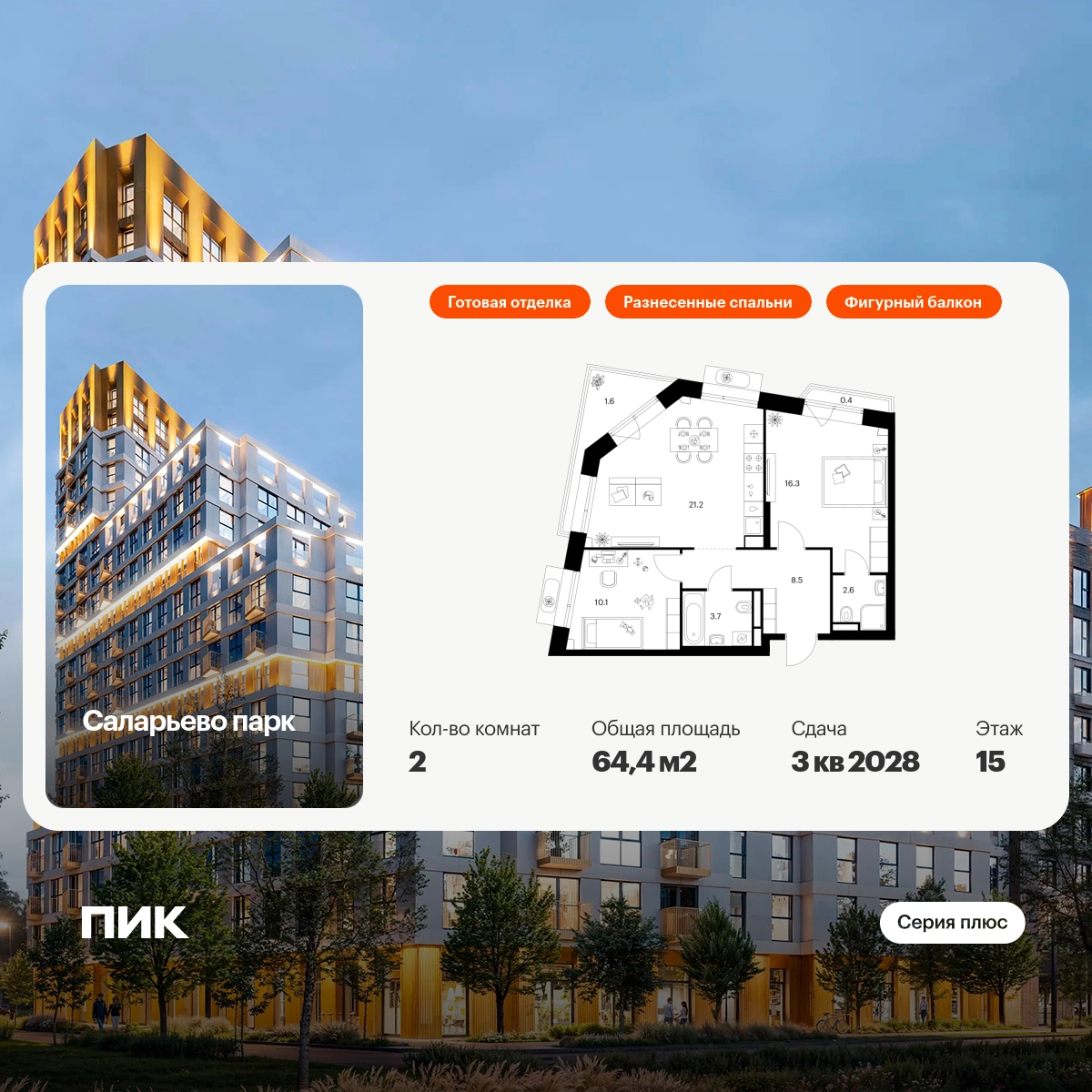 Продаётся 2-комн.квартира площадью 64.40 кв.м на 15 этаже 22 этажного дома (Корпус 73, секция 1) проекта ПИК Саларьево парк. Светлый просторный подъезд на уровне земли, функциональная планировка, большие окна, с отделкой. Жилой район «Саларьево парк» расположен в Новой Москве, в четырёх километрах от МКАД по Киевскому шоссе. Две станции метро: «Саларьево» и «Филатов луг», — находятся в пешей доступности от проекта. Дойти до них можно за 5–10 минут. В квартале уже создана качественная среда, где есть абсолютно всё для полноценной жизни, работы и отдыха. «Саларьево парк» — не просто квартал, а полноценный жилой район, который отличается разноплановой архитектурой. Над концепцией квартала работали несколько ведущих архитектурных бюро, которые стремились добиться разнообразия в фасадных решениях. Ярким примером такого подхода станут корпуса 82 и 83, которые относятся к «Серии плюс». Новый корпус 83 был создан по принципам южной архитектуры: расслабленный и лаконичный силуэт зданий, привлекающий к себе внимание. Архитектурная изюминка 83-го корпуса — террасы и фигурные балконы. Вместе с окнами и другими акцентными элементами они создают уникальный облик здания, отсылая нас к изысканной южной архитектуре. Все корпуса в квартале гармонично сочетаются, образуя единую городскую среду. Здесь приятно гулять и проводить время на улице всей семьёй. В «Саларьево парке» создана уникальная образовательная среда, включающая в себя шесть школ, рассчитанных на 6 250 учеников. Четыре из них уже открыты, их посещает 2 300 детей. Также на территории «Саларьево парка» находится 12 детских садов, один из которых с бассейном. Сейчас уже открыты 8 садов. В «Саларьево парке» открыта уникальная игровая площадка — PlayHub «Оригами». Здесь есть ручей, горка-труба и рельефные холмы. Взрослые смогут отдохнуть в уютном кафе, пока дети играют. Также на территории проекта есть SportHub — большая спортивная зона, разделённая по интересам и возрастам. Здесь можно заниматься разными видами спорта: футболом, баскетболом, волейболом и стритболом. Зимой центральную часть площадки превращают в каток. Во дворах-парках жилого квартала есть места для отдыха, детские и спортивные площадки. На первых этажах домов расположены магазины, кафе и полезные сервисы. Также вблизи проекта есть несколько масштабных торговых центров. До ТЦ «Саларис» пять минут пешком, до «Рио», Metro Cash & Carry и «Леруа Мерлен» — пять минут на автомобиле. Артикул - 1016525О застройщике
