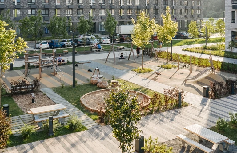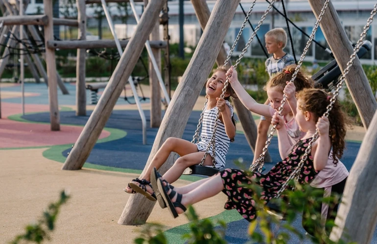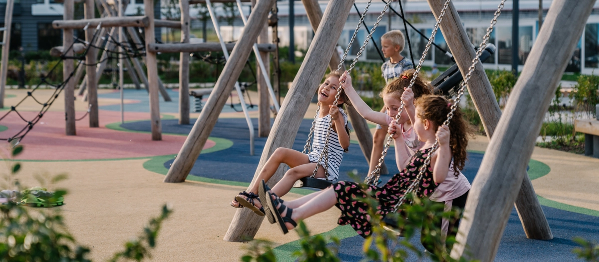Чтобы дети как можно больше времени проводили на улице, мы придумали особый формат игровых площадок — PlayHub. Каждая из них с уникальным ландшафтом и игровыми плотинами на искусственном ручье. А благодаря абстрактным формам игрового оборудования дети могут придумать бесконечное количество игр.