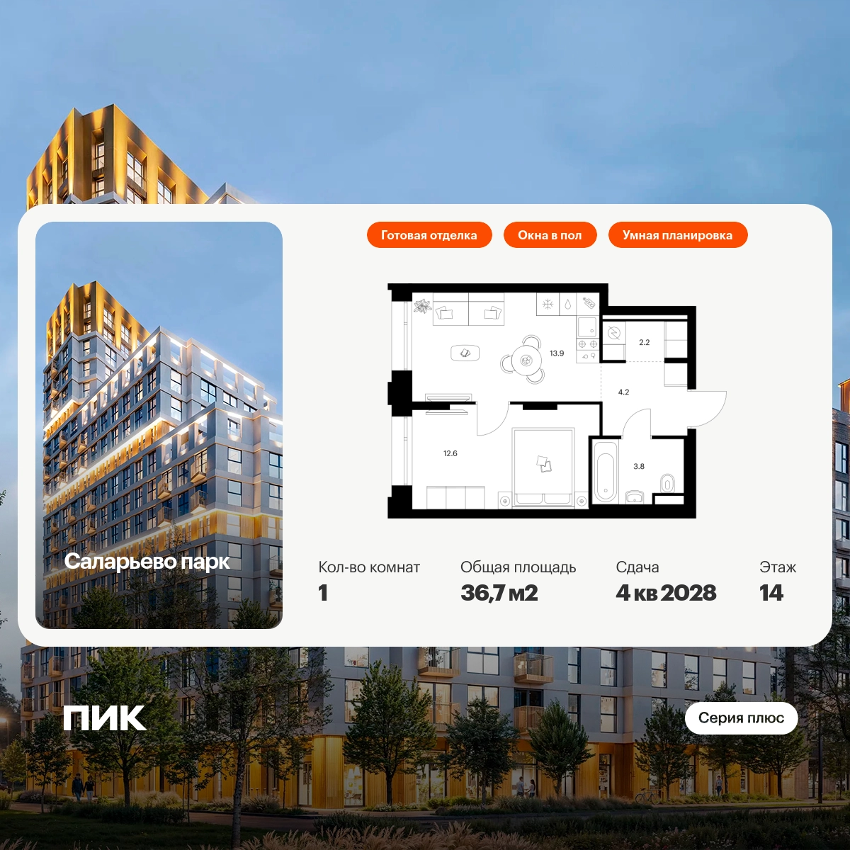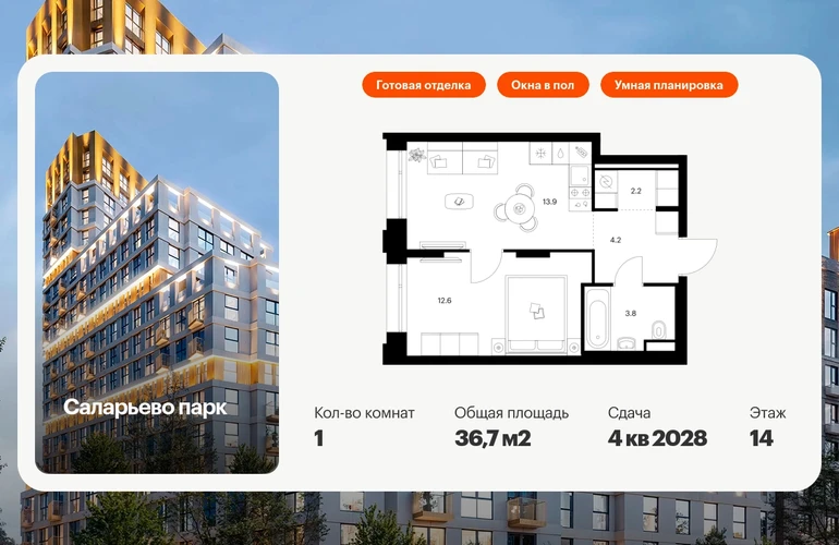 Продаётся 1-комн.квартира площадью 36.70 кв.м на 14 этаже 24 этажного дома (Корпус 82.8, секция 8) проекта ПИК Саларьево парк. Светлый просторный подъезд на уровне земли, функциональная планировка, большие окна, с отделкой. Артикул - 1033257О застройщике