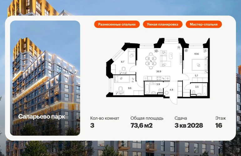 Продаётся 3-комн.квартира площадью 73.60 кв.м на 16 этаже 23 этажного дома (Корпус 69.1, секция 1) проекта ПИК Саларьево парк. Светлый просторный подъезд на уровне земли, функциональная планировка, большие окна, с отделкой. Артикул - 1023369О застройщике