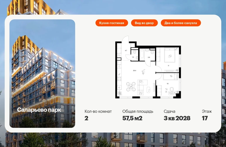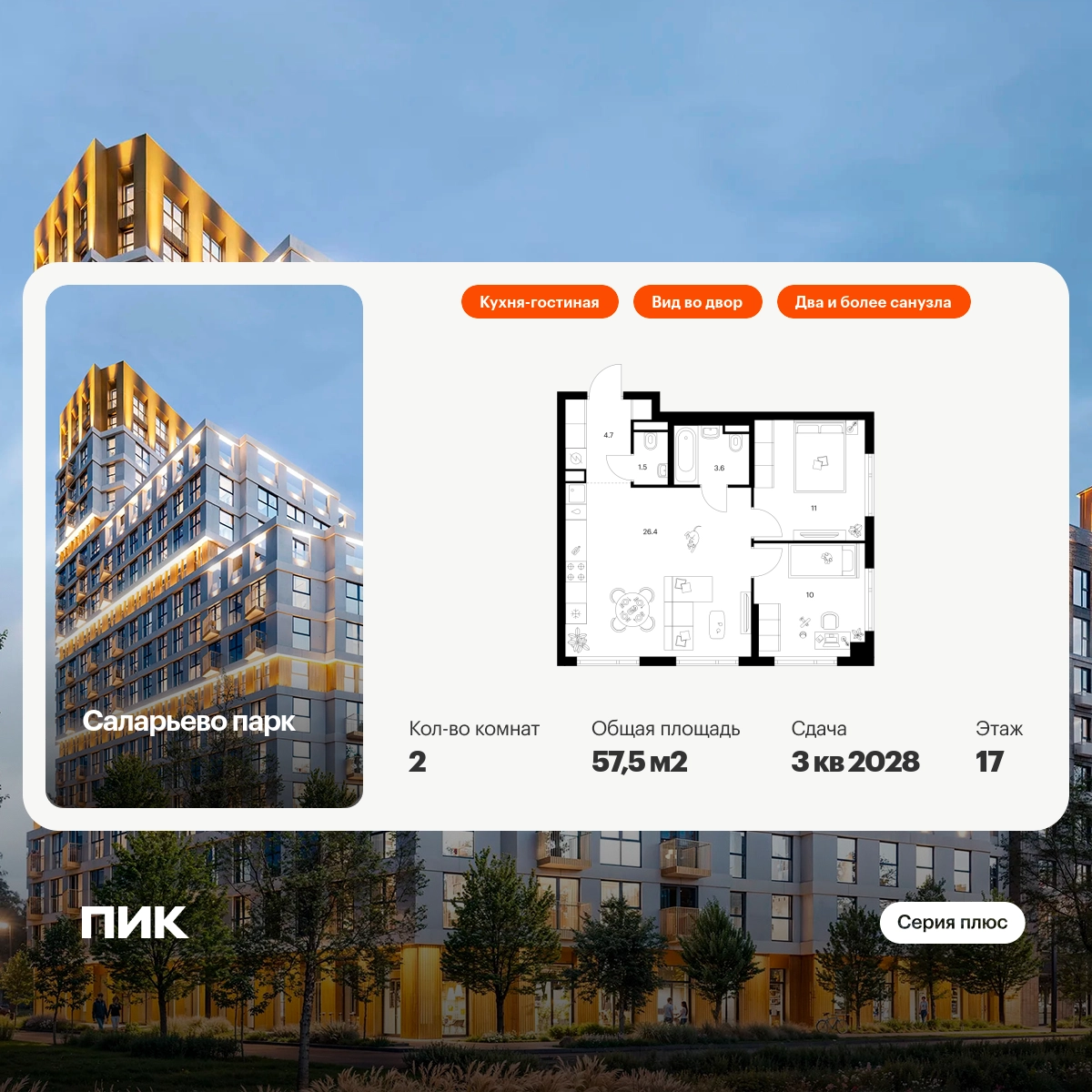 Продаётся 2-комн.квартира площадью 57.50 кв.м на 17 этаже 23 этажного дома (Корпус 69.1, секция 1) проекта ПИК Саларьево парк. Светлый просторный подъезд на уровне земли, функциональная планировка, большие окна, с отделкой. Артикул - 1023377О застройщике