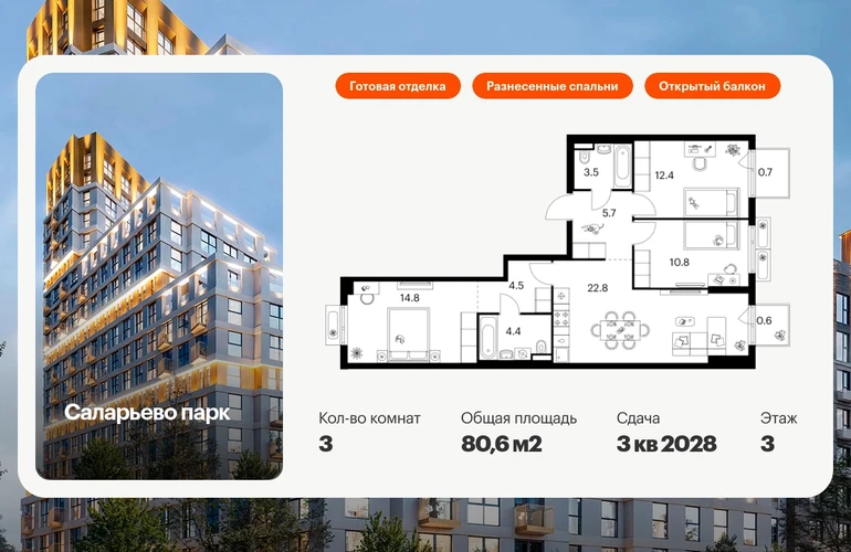 Продаётся 3-комн.квартира площадью 80.60 кв.м на 3 этаже 14 этажного дома (Корпус 69.2, секция 2) проекта ПИК Саларьево парк. Светлый просторный подъезд на уровне земли, функциональная планировка, большие окна, с отделкой. Артикул - 1023454О застройщике