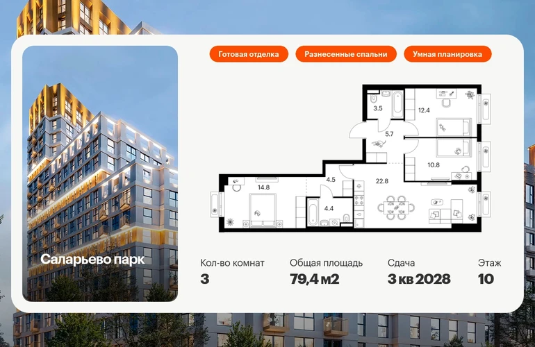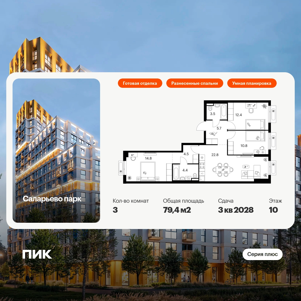Продаётся 3-комн.квартира площадью 79.40 кв.м на 10 этаже 14 этажного дома (Корпус 69.2, секция 2) проекта ПИК Саларьево парк. Светлый просторный подъезд на уровне земли, функциональная планировка, большие окна, с отделкой. Артикул - 1023531О застройщике