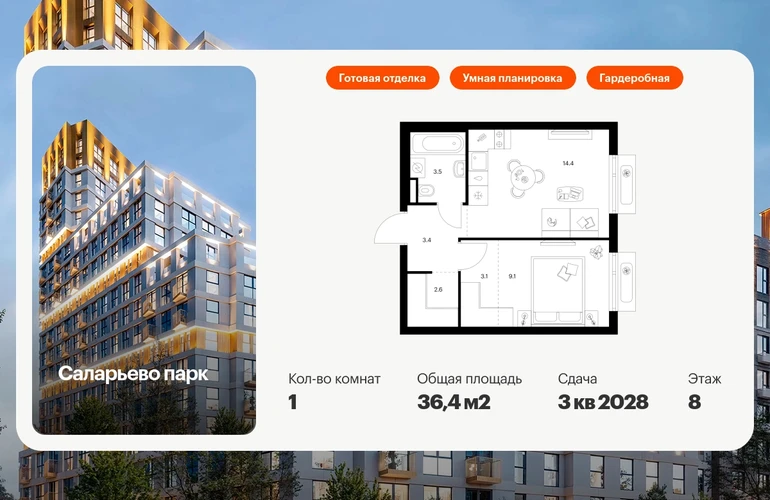 Продаётся 1-комн.квартира площадью 36.40 кв.м на 8 этаже 14 этажного дома (Корпус 69.2, секция 2) проекта ПИК Саларьево парк. Светлый просторный подъезд на уровне земли, функциональная планировка, большие окна, с отделкой. Артикул - 1023508О застройщике