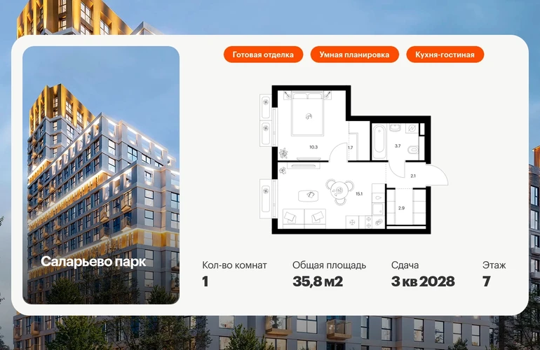 Продаётся 1-комн.квартира площадью 35.80 кв.м на 7 этаже 14 этажного дома (Корпус 69.7, секция 7) проекта ПИК Саларьево парк. Светлый просторный подъезд на уровне земли, функциональная планировка, большие окна, с отделкой. Артикул - 1024161О застройщике