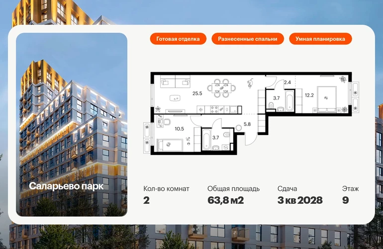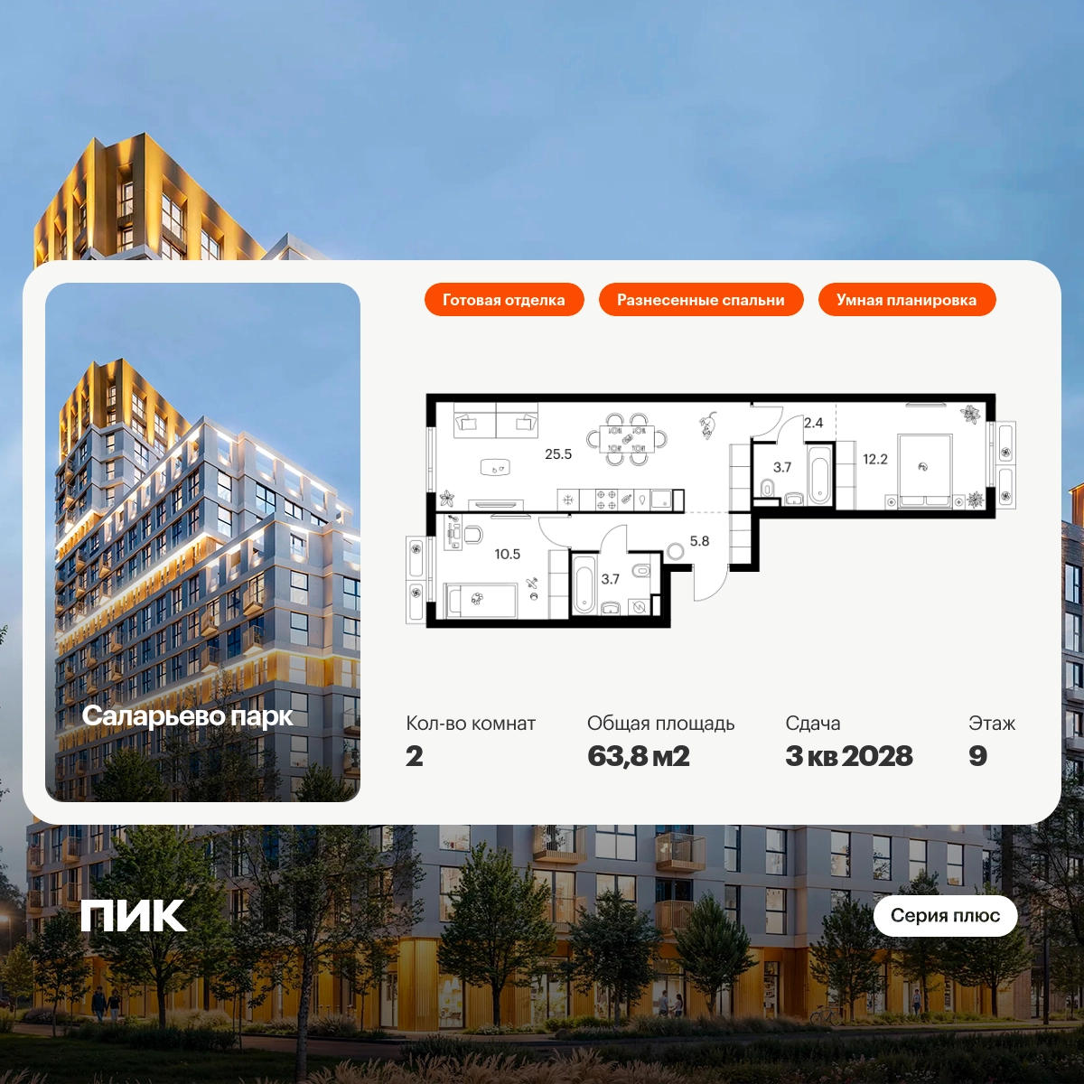 Продаётся 2-комн.квартира площадью 63.80 кв.м на 9 этаже 14 этажного дома (Корпус 69.7, секция 7) проекта ПИК Саларьево парк. Светлый просторный подъезд на уровне земли, функциональная планировка, большие окна, с отделкой. Артикул - 1024177О застройщике