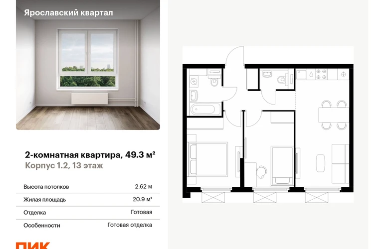 Продаётся 2-комн.квартира площадью 49.30 кв.м на 13 этаже 25 этажного дома (Корпус 1.2, секция 1) проекта ПИК Ярославский квартал. Светлый просторный подъезд на уровне земли, функциональная планировка, большие окна, с отделкой. <br> <br>Проект «Ярославский квартал» возводится в Мытищах, в 6 км от МКАД. Жилой квартал, состоящий из 8 корпусов, строится рядом с Ярославским шоссе и имеет удобный заезд с крупной автомагистрали. <br> <br>На территории проекта появится школа, детский сад и пешеходный бульвар. Индивидуальные дизайны фасадов для «Ярославского квартала» разработало петербургское архитектурное бюро RHIZOME. В их портфолио вошли работы для Московского музея современного искусства, ГЦСИ, Манифеста 10 и ЦВЗ Манеж. <br> <br>За 7 минут можно дойти пешком до ближайшей автобусной остановки. Столько же займёт дорога до «Лосиного острова» — облагороженного парка с разными активностями для всей семьи, благоустроенными зонами для отдыха, местами для прогулок и пробежек на свежем воздухе. <br> <br>Доехать на автомобиле до Ярославского шоссе получится за 3 минуты, до станции «Мытищи» — за 9 минут, до МКАД — за 15 минут. Артикул - 910770О застройщике