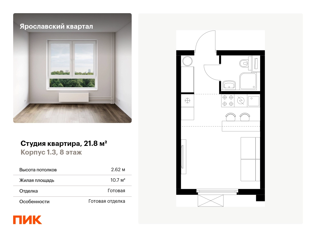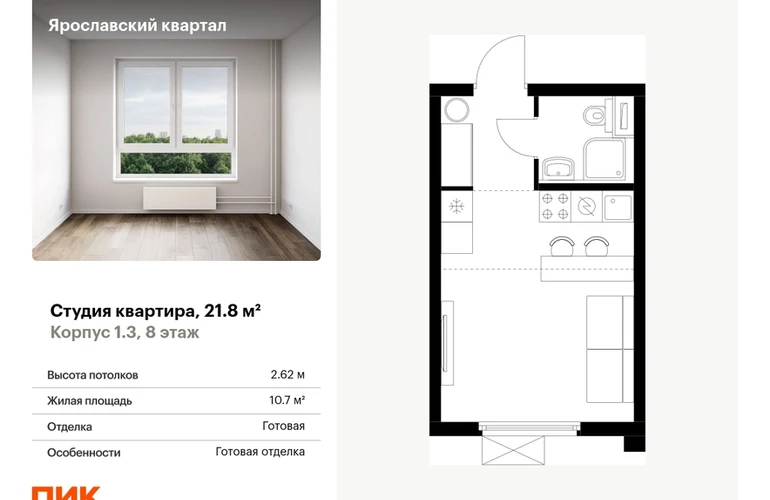 Продаётся квартира-студия площадью 21.80 кв.м на 8 этаже 24 этажного дома (Корпус 1.3, секция 1) проекта ПИК Ярославский квартал. Светлый просторный подъезд на уровне земли, функциональная планировка, большие окна, с отделкой. <br> <br>Проект «Ярославский квартал» возводится в Мытищах, в 6 км от МКАД. Жилой квартал, состоящий из 8 корпусов, строится рядом с Ярославским шоссе и имеет удобный заезд с крупной автомагистрали. <br> <br>На территории проекта появится школа, детский сад и пешеходный бульвар. Индивидуальные дизайны фасадов для «Ярославского квартала» разработало петербургское архитектурное бюро RHIZOME. В их портфолио вошли работы для Московского музея современного искусства, ГЦСИ, Манифеста 10 и ЦВЗ Манеж. <br> <br>За 7 минут можно дойти пешком до ближайшей автобусной остановки. Столько же займёт дорога до «Лосиного острова» — облагороженного парка с разными активностями для всей семьи, благоустроенными зонами для отдыха, местами для прогулок и пробежек на свежем воздухе. <br> <br>Доехать на автомобиле до Ярославского шоссе получится за 3 минуты, до станции «Мытищи» — за 9 минут, до МКАД — за 15 минут. Артикул - 910946О застройщике