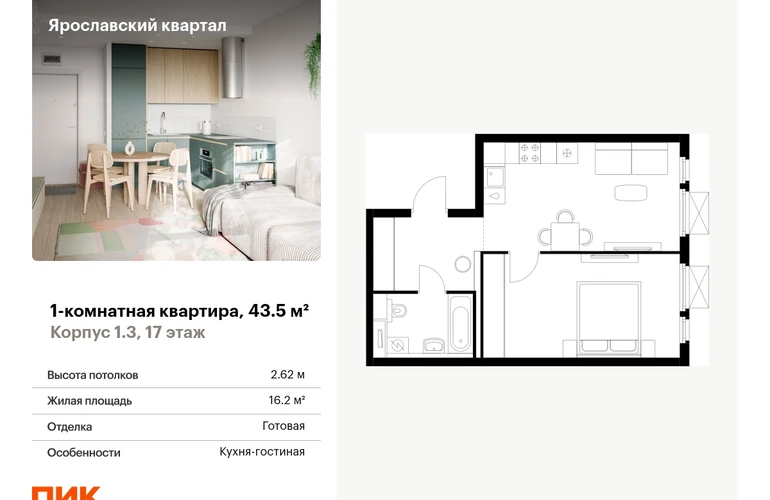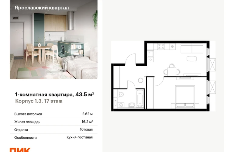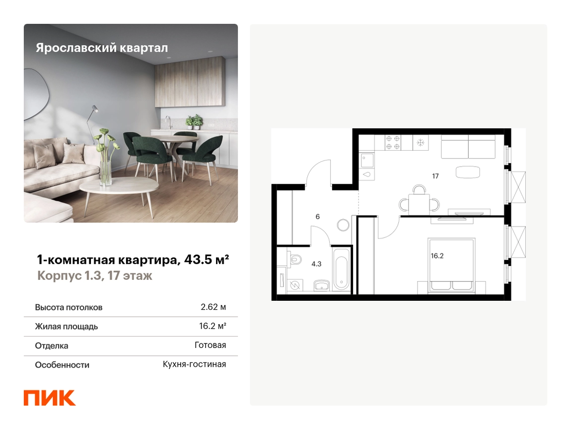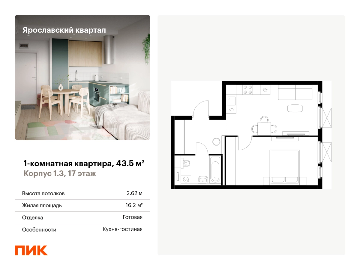 Продаётся 1-комн.квартира площадью 43.50 кв.м на 17 этаже 24 этажного дома (Корпус 1.3, секция 1) проекта ПИК Ярославский квартал. Светлый просторный подъезд на уровне земли, функциональная планировка, большие окна, с отделкой. <br> <br>Проект «Ярославский квартал» возводится в Мытищах, в 6 км от МКАД. Жилой квартал, состоящий из 8 корпусов, строится рядом с Ярославским шоссе и имеет удобный заезд с крупной автомагистрали. <br> <br>На территории проекта появится школа, детский сад и пешеходный бульвар. Индивидуальные дизайны фасадов для «Ярославского квартала» разработало петербургское архитектурное бюро RHIZOME. В их портфолио вошли работы для Московского музея современного искусства, ГЦСИ, Манифеста 10 и ЦВЗ Манеж. <br> <br>За 7 минут можно дойти пешком до ближайшей автобусной остановки. Столько же займёт дорога до «Лосиного острова» — облагороженного парка с разными активностями для всей семьи, благоустроенными зонами для отдыха, местами для прогулок и пробежек на свежем воздухе. <br> <br>Доехать на автомобиле до Ярославского шоссе получится за 3 минуты, до станции «Мытищи» — за 9 минут, до МКАД — за 15 минут. Артикул - 911170О застройщике