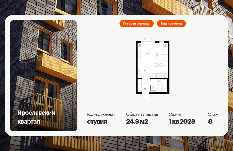 Продаётся квартира-студия площадью 24.90 кв.м на 8 этаже 25 этажного дома (Корпус 2.2, секция 1) проекта ПИК Ярославский квартал. Светлый просторный подъезд на уровне земли, функциональная планировка, большие окна, с отделкой. Проект «Ярославский квартал» возводится в Мытищах, в 6 км от МКАД. Жилой квартал, состоящий из 8 корпусов, строится рядом с Ярославским шоссе и имеет удобный заезд с крупной автомагистрали. На территории проекта появится школа, детский сад и пешеходный бульвар. Индивидуальные дизайны фасадов для «Ярославского квартала» разработало петербургское архитектурное бюро RHIZOME. В их портфолио вошли работы для Московского музея современного искусства, ГЦСИ, Манифеста 10 и ЦВЗ Манеж. За 7 минут можно дойти пешком до ближайшей автобусной остановки. Столько же займёт дорога до «Лосиного острова» — облагороженного парка с разными активностями для всей семьи, благоустроенными зонами для отдыха, местами для прогулок и пробежек на свежем воздухе. Доехать на автомобиле до Ярославского шоссе получится за 3 минуты, до станции «Мытищи» — за 9 минут, до МКАД — за 15 минут. Артикул - 1013108О застройщике