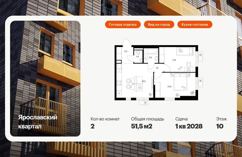 Продаётся 2-комн.квартира площадью 51.50 кв.м на 10 этаже 25 этажного дома (Корпус 2.4, секция 1) проекта ПИК Ярославский квартал. Светлый просторный подъезд на уровне земли, функциональная планировка, большие окна, с отделкой. Проект «Ярославский квартал» возводится в Мытищах, в 6 км от МКАД. Жилой квартал, состоящий из 8 корпусов, строится рядом с Ярославским шоссе и имеет удобный заезд с крупной автомагистрали. На территории проекта появится школа, детский сад и пешеходный бульвар. Индивидуальные дизайны фасадов для «Ярославского квартала» разработало петербургское архитектурное бюро RHIZOME. В их портфолио вошли работы для Московского музея современного искусства, ГЦСИ, Манифеста 10 и ЦВЗ Манеж. За 7 минут можно дойти пешком до ближайшей автобусной остановки. Столько же займёт дорога до «Лосиного острова» — облагороженного парка с разными активностями для всей семьи, благоустроенными зонами для отдыха, местами для прогулок и пробежек на свежем воздухе. Доехать на автомобиле до Ярославского шоссе получится за 3 минуты, до станции «Мытищи» — за 9 минут, до МКАД — за 15 минут. Артикул - 1013459О застройщике