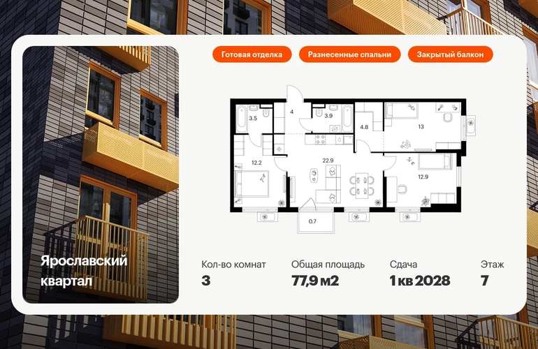 Продаётся 3-комн.квартира площадью 77.90 кв.м на 7 этаже 25 этажного дома (Корпус 2.4, секция 1) проекта ПИК Ярославский квартал. Светлый просторный подъезд на уровне земли, функциональная планировка, большие окна, с отделкой. Проект «Ярославский квартал» возводится в Мытищах, в 6 км от МКАД. Жилой квартал, состоящий из 8 корпусов, строится рядом с Ярославским шоссе и имеет удобный заезд с крупной автомагистрали. На территории проекта появится школа, детский сад и пешеходный бульвар. Индивидуальные дизайны фасадов для «Ярославского квартала» разработало петербургское архитектурное бюро RHIZOME. В их портфолио вошли работы для Московского музея современного искусства, ГЦСИ, Манифеста 10 и ЦВЗ Манеж. За 7 минут можно дойти пешком до ближайшей автобусной остановки. Столько же займёт дорога до «Лосиного острова» — облагороженного парка с разными активностями для всей семьи, благоустроенными зонами для отдыха, местами для прогулок и пробежек на свежем воздухе. Доехать на автомобиле до Ярославского шоссе получится за 3 минуты, до станции «Мытищи» — за 9 минут, до МКАД — за 15 минут. Артикул - 1013405О застройщике