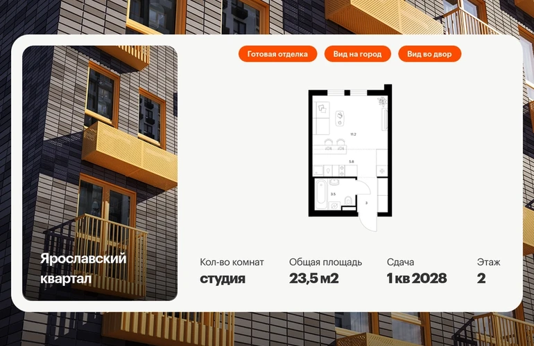 Продаётся квартира-студия площадью 23.50 кв.м на 2 этаже 25 этажного дома (Корпус 2.4, секция 1) проекта ПИК Ярославский квартал. Светлый просторный подъезд на уровне земли, функциональная планировка, большие окна, с отделкой. Проект «Ярославский квартал» возводится в Мытищах, в 6 км от МКАД. Жилой квартал, состоящий из 8 корпусов, строится рядом с Ярославским шоссе и имеет удобный заезд с крупной автомагистрали. На территории проекта появится школа, детский сад и пешеходный бульвар. Индивидуальные дизайны фасадов для «Ярославского квартала» разработало петербургское архитектурное бюро RHIZOME. В их портфолио вошли работы для Московского музея современного искусства, ГЦСИ, Манифеста 10 и ЦВЗ Манеж. За 7 минут можно дойти пешком до ближайшей автобусной остановки. Столько же займёт дорога до «Лосиного острова» — облагороженного парка с разными активностями для всей семьи, благоустроенными зонами для отдыха, местами для прогулок и пробежек на свежем воздухе. Доехать на автомобиле до Ярославского шоссе получится за 3 минуты, до станции «Мытищи» — за 9 минут, до МКАД — за 15 минут. Артикул - 1013349О застройщике