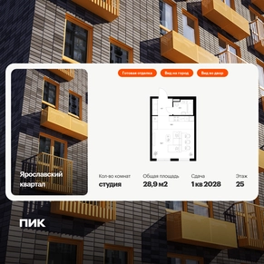 Продаётся квартира-студия площадью 28.90 кв.м на 25 этаже 25 этажного дома (Корпус 2.2, секция 1) проекта ПИК Ярославский квартал. Светлый просторный подъезд на уровне земли, функциональная планировка, большие окна, с отделкой. Проект «Ярославский квартал» возводится в Мытищах, в 6 км от МКАД. Жилой квартал, состоящий из 8 корпусов, строится рядом с Ярославским шоссе и имеет удобный заезд с крупной автомагистрали. На территории проекта появится школа, детский сад и пешеходный бульвар. Индивидуальные дизайны фасадов для «Ярославского квартала» разработало петербургское архитектурное бюро RHIZOME. В их портфолио вошли работы для Московского музея современного искусства, ГЦСИ, Манифеста 10 и ЦВЗ Манеж. За 7 минут можно дойти пешком до ближайшей автобусной остановки. Столько же займёт дорога до «Лосиного острова» — облагороженного парка с разными активностями для всей семьи, благоустроенными зонами для отдыха, местами для прогулок и пробежек на свежем воздухе. Доехать на автомобиле до Ярославского шоссе получится за 3 минуты, до станции «Мытищи» — за 9 минут, до МКАД — за 15 минут. Артикул - 1013328О застройщике