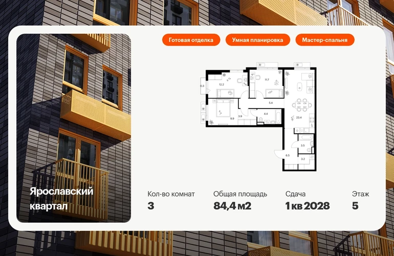 Продаётся 3-комн.квартира площадью 84.40 кв.м на 5 этаже 25 этажного дома (Корпус 2.2, секция 1) проекта ПИК Ярославский квартал. Светлый просторный подъезд на уровне земли, функциональная планировка, большие окна, с отделкой. Проект «Ярославский квартал» возводится в Мытищах, в 6 км от МКАД. Жилой квартал, состоящий из 8 корпусов, строится рядом с Ярославским шоссе и имеет удобный заезд с крупной автомагистрали. На территории проекта появится школа, детский сад и пешеходный бульвар. Индивидуальные дизайны фасадов для «Ярославского квартала» разработало петербургское архитектурное бюро RHIZOME. В их портфолио вошли работы для Московского музея современного искусства, ГЦСИ, Манифеста 10 и ЦВЗ Манеж. За 7 минут можно дойти пешком до ближайшей автобусной остановки. Столько же займёт дорога до «Лосиного острова» — облагороженного парка с разными активностями для всей семьи, благоустроенными зонами для отдыха, местами для прогулок и пробежек на свежем воздухе. Доехать на автомобиле до Ярославского шоссе получится за 3 минуты, до станции «Мытищи» — за 9 минут, до МКАД — за 15 минут. Артикул - 1013067О застройщике