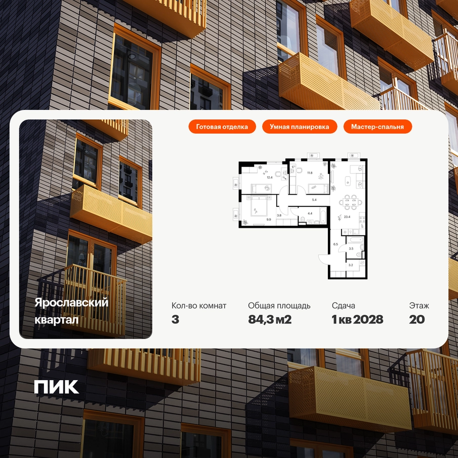 Продаётся 3-комн.квартира площадью 84.30 кв.м на 20 этаже 25 этажного дома (Корпус 2.2, секция 1) проекта ПИК Ярославский квартал. Светлый просторный подъезд на уровне земли, функциональная планировка, большие окна, с отделкой. Проект «Ярославский квартал» возводится в Мытищах, в 6 км от МКАД. Жилой квартал, состоящий из 8 корпусов, строится рядом с Ярославским шоссе и имеет удобный заезд с крупной автомагистрали. На территории проекта появится школа, детский сад и пешеходный бульвар. Индивидуальные дизайны фасадов для «Ярославского квартала» разработало петербургское архитектурное бюро RHIZOME. В их портфолио вошли работы для Московского музея современного искусства, ГЦСИ, Манифеста 10 и ЦВЗ Манеж. За 7 минут можно дойти пешком до ближайшей автобусной остановки. Столько же займёт дорога до «Лосиного острова» — облагороженного парка с разными активностями для всей семьи, благоустроенными зонами для отдыха, местами для прогулок и пробежек на свежем воздухе. Доехать на автомобиле до Ярославского шоссе получится за 3 минуты, до станции «Мытищи» — за 9 минут, до МКАД — за 15 минут. Артикул - 1013266О застройщике