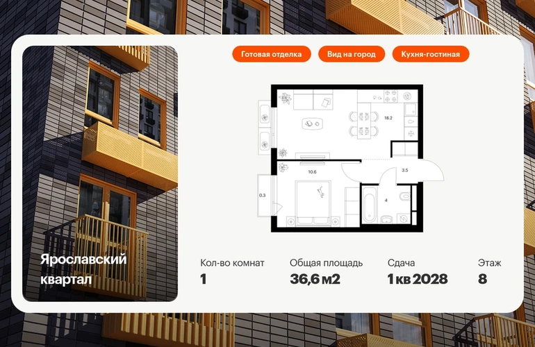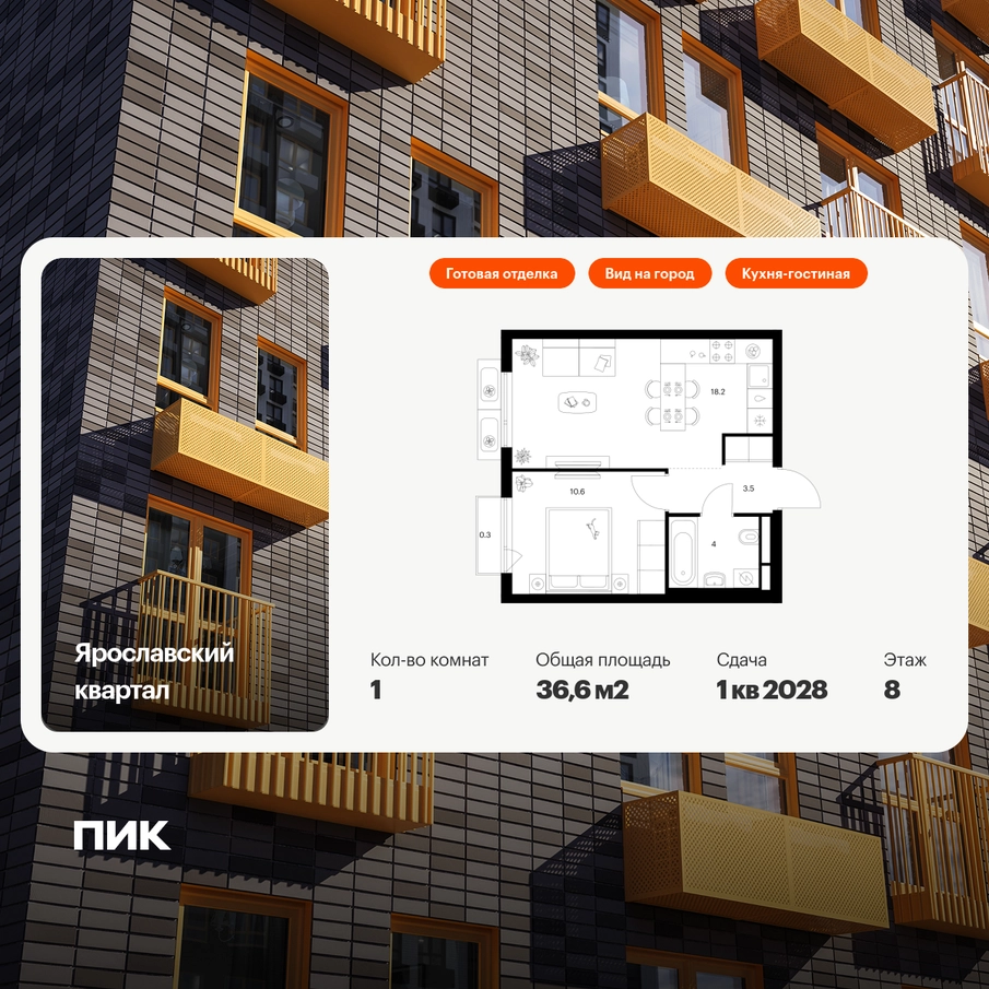 Продаётся 1-комн.квартира площадью 36.60 кв.м на 8 этаже 25 этажного дома (Корпус 2.2, секция 1) проекта ПИК Ярославский квартал. Светлый просторный подъезд на уровне земли, функциональная планировка, большие окна, с отделкой. Проект «Ярославский квартал» возводится в Мытищах, в 6 км от МКАД. Жилой квартал, состоящий из 8 корпусов, строится рядом с Ярославским шоссе и имеет удобный заезд с крупной автомагистрали. На территории проекта появится школа, детский сад и пешеходный бульвар. Индивидуальные дизайны фасадов для «Ярославского квартала» разработало петербургское архитектурное бюро RHIZOME. В их портфолио вошли работы для Московского музея современного искусства, ГЦСИ, Манифеста 10 и ЦВЗ Манеж. За 7 минут можно дойти пешком до ближайшей автобусной остановки. Столько же займёт дорога до «Лосиного острова» — облагороженного парка с разными активностями для всей семьи, благоустроенными зонами для отдыха, местами для прогулок и пробежек на свежем воздухе. Доехать на автомобиле до Ярославского шоссе получится за 3 минуты, до станции «Мытищи» — за 9 минут, до МКАД — за 15 минут. Артикул - 1013103О застройщике