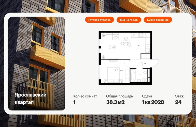 Продаётся 1-комн.квартира площадью 38.30 кв.м на 24 этаже 25 этажного дома (Корпус 2.4, секция 1) проекта ПИК Ярославский квартал. Светлый просторный подъезд на уровне земли, функциональная планировка, большие окна, с отделкой. Проект «Ярославский квартал» возводится в Мытищах, в 6 км от МКАД. Жилой квартал, состоящий из 8 корпусов, строится рядом с Ярославским шоссе и имеет удобный заезд с крупной автомагистрали. На территории проекта появится школа, детский сад и пешеходный бульвар. Индивидуальные дизайны фасадов для «Ярославского квартала» разработало петербургское архитектурное бюро RHIZOME. В их портфолио вошли работы для Московского музея современного искусства, ГЦСИ, Манифеста 10 и ЦВЗ Манеж. За 7 минут можно дойти пешком до ближайшей автобусной остановки. Столько же займёт дорога до «Лосиного острова» — облагороженного парка с разными активностями для всей семьи, благоустроенными зонами для отдыха, местами для прогулок и пробежек на свежем воздухе. Доехать на автомобиле до Ярославского шоссе получится за 3 минуты, до станции «Мытищи» — за 9 минут, до МКАД — за 15 минут. Артикул - 1013633О застройщике