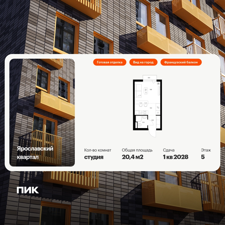 Продаётся квартира-студия площадью 20.40 кв.м на 5 этаже 25 этажного дома (Корпус 2.2, секция 1) проекта ПИК Ярославский квартал. Светлый просторный подъезд на уровне земли, функциональная планировка, большие окна, с отделкой. Проект «Ярославский квартал» возводится в Мытищах, в 6 км от МКАД. Жилой квартал, состоящий из 8 корпусов, строится рядом с Ярославским шоссе и имеет удобный заезд с крупной автомагистрали. На территории проекта появится школа, детский сад и пешеходный бульвар. Индивидуальные дизайны фасадов для «Ярославского квартала» разработало петербургское архитектурное бюро RHIZOME. В их портфолио вошли работы для Московского музея современного искусства, ГЦСИ, Манифеста 10 и ЦВЗ Манеж. За 7 минут можно дойти пешком до ближайшей автобусной остановки. Столько же займёт дорога до «Лосиного острова» — облагороженного парка с разными активностями для всей семьи, благоустроенными зонами для отдыха, местами для прогулок и пробежек на свежем воздухе. Доехать на автомобиле до Ярославского шоссе получится за 3 минуты, до станции «Мытищи» — за 9 минут, до МКАД — за 15 минут. Артикул - 1013072О застройщике