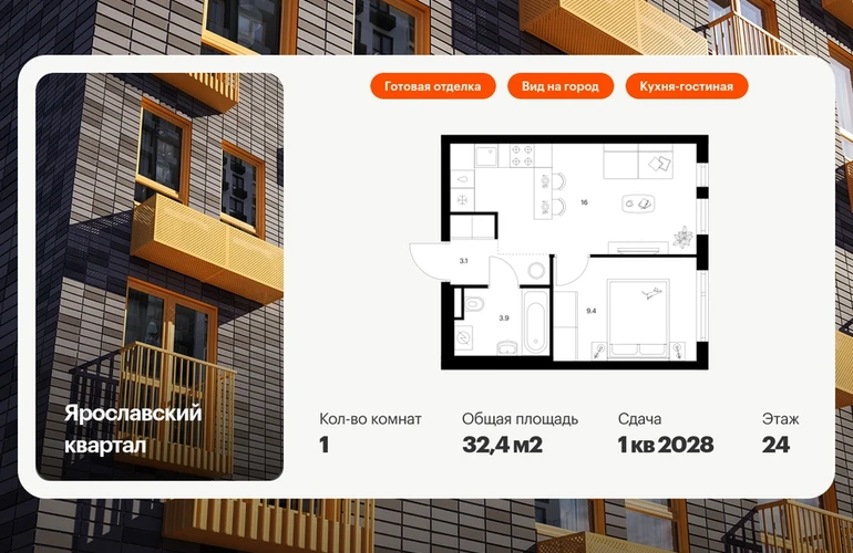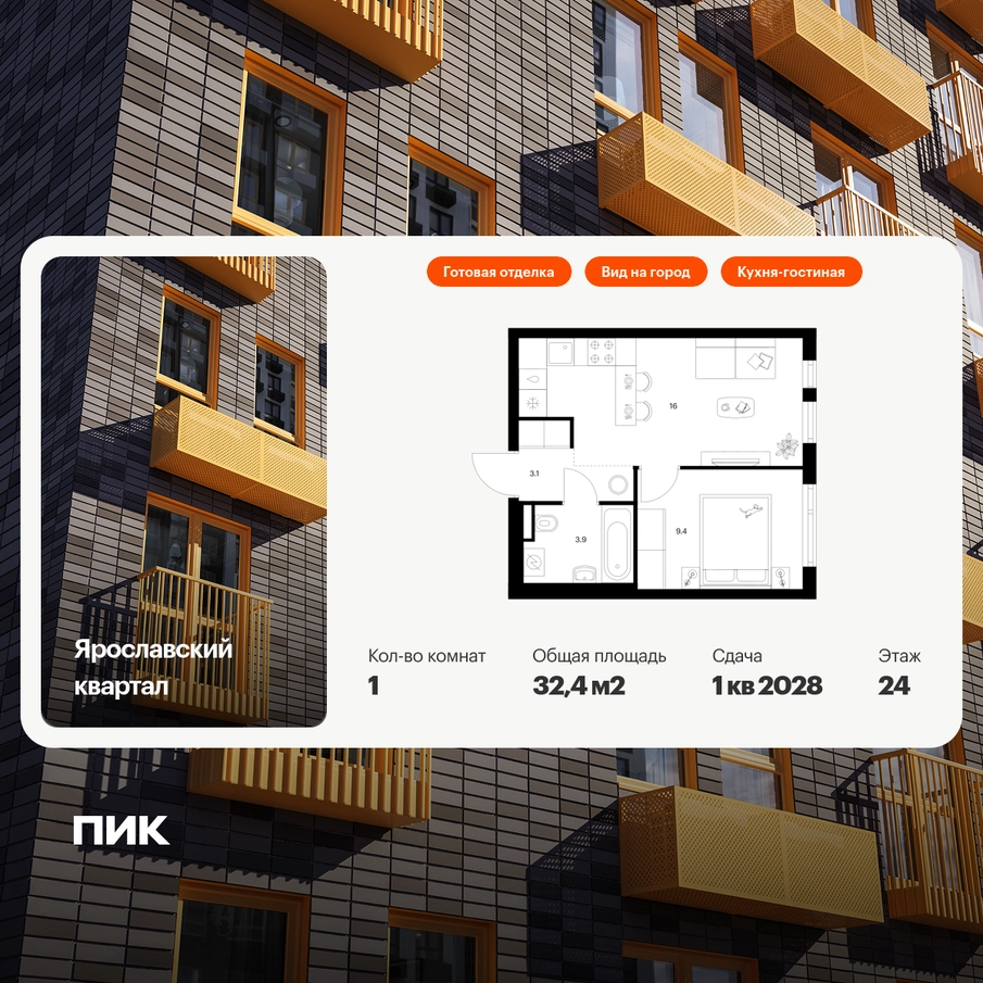 Продаётся 1-комн.квартира площадью 32.40 кв.м на 24 этаже 25 этажного дома (Корпус 2.4, секция 1) проекта ПИК Ярославский квартал. Светлый просторный подъезд на уровне земли, функциональная планировка, большие окна, с отделкой. Проект «Ярославский квартал» возводится в Мытищах, в 6 км от МКАД. Жилой квартал, состоящий из 8 корпусов, строится рядом с Ярославским шоссе и имеет удобный заезд с крупной автомагистрали. На территории проекта появится школа, детский сад и пешеходный бульвар. Индивидуальные дизайны фасадов для «Ярославского квартала» разработало петербургское архитектурное бюро RHIZOME. В их портфолио вошли работы для Московского музея современного искусства, ГЦСИ, Манифеста 10 и ЦВЗ Манеж. За 7 минут можно дойти пешком до ближайшей автобусной остановки. Столько же займёт дорога до «Лосиного острова» — облагороженного парка с разными активностями для всей семьи, благоустроенными зонами для отдыха, местами для прогулок и пробежек на свежем воздухе. Доехать на автомобиле до Ярославского шоссе получится за 3 минуты, до станции «Мытищи» — за 9 минут, до МКАД — за 15 минут. Артикул - 1013636О застройщике