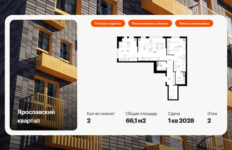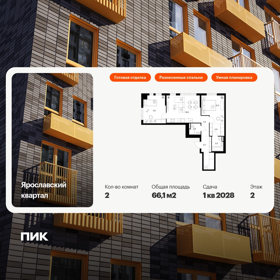 Продаётся 2-комн.квартира площадью 66.10 кв.м на 2 этаже 25 этажного дома (Корпус 2.4, секция 1) проекта ПИК Ярославский квартал. Светлый просторный подъезд на уровне земли, функциональная планировка, большие окна, с отделкой. Проект «Ярославский квартал» возводится в Мытищах, в 6 км от МКАД. Жилой квартал, состоящий из 8 корпусов, строится рядом с Ярославским шоссе и имеет удобный заезд с крупной автомагистрали. На территории проекта появится школа, детский сад и пешеходный бульвар. Индивидуальные дизайны фасадов для «Ярославского квартала» разработало петербургское архитектурное бюро RHIZOME. В их портфолио вошли работы для Московского музея современного искусства, ГЦСИ, Манифеста 10 и ЦВЗ Манеж. За 7 минут можно дойти пешком до ближайшей автобусной остановки. Столько же займёт дорога до «Лосиного острова» — облагороженного парка с разными активностями для всей семьи, благоустроенными зонами для отдыха, местами для прогулок и пробежек на свежем воздухе. Доехать на автомобиле до Ярославского шоссе получится за 3 минуты, до станции «Мытищи» — за 9 минут, до МКАД — за 15 минут. Артикул - 1013344О застройщике