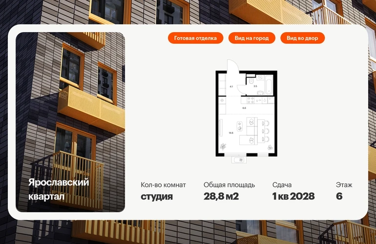 Продаётся квартира-студия площадью 28.80 кв.м на 6 этаже 25 этажного дома (Корпус 2.2, секция 1) проекта ПИК Ярославский квартал. Светлый просторный подъезд на уровне земли, функциональная планировка, большие окна, с отделкой. Проект «Ярославский квартал» возводится в Мытищах, в 6 км от МКАД. Жилой квартал, состоящий из 8 корпусов, строится рядом с Ярославским шоссе и имеет удобный заезд с крупной автомагистрали. На территории проекта появится школа, детский сад и пешеходный бульвар. Индивидуальные дизайны фасадов для «Ярославского квартала» разработало петербургское архитектурное бюро RHIZOME. В их портфолио вошли работы для Московского музея современного искусства, ГЦСИ, Манифеста 10 и ЦВЗ Манеж. За 7 минут можно дойти пешком до ближайшей автобусной остановки. Столько же займёт дорога до «Лосиного острова» — облагороженного парка с разными активностями для всей семьи, благоустроенными зонами для отдыха, местами для прогулок и пробежек на свежем воздухе. Доехать на автомобиле до Ярославского шоссе получится за 3 минуты, до станции «Мытищи» — за 9 минут, до МКАД — за 15 минут. Артикул - 1013076О застройщике