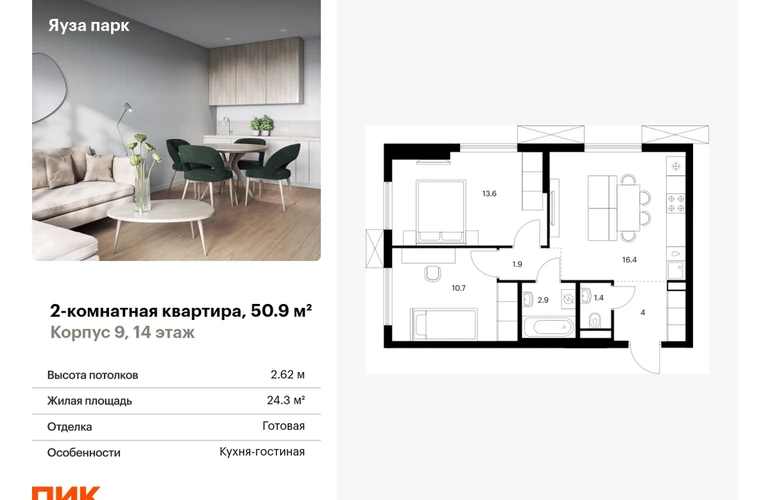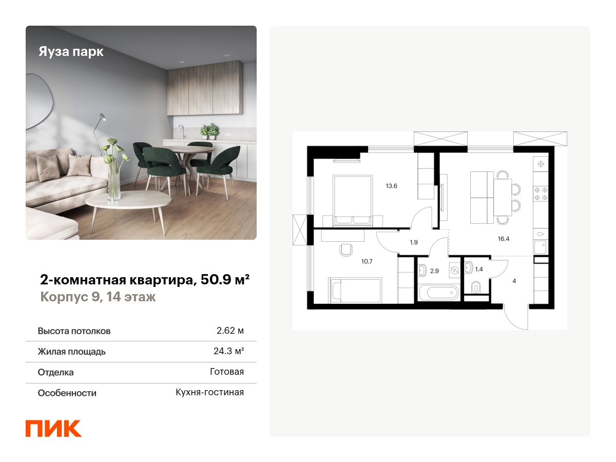 Продаётся 2-комн.квартира площадью 50.90 кв.м на 14 этаже 25 этажного дома (Корпус 9, секция 1) проекта ПИК Яуза парк. Светлый просторный подъезд на уровне земли, функциональная планировка, большие окна, с отделкой. <br> <br>Жилой квартал «Яуза парк» возводится в Мытищах, в 5 минутах ходьбы от одноимённой ж/д станции. <br> <br>Проект включает 20 домов разной этажности с благоустроенными дворами-парками. <br> <br>Индивидуальный дизайн фасадов разработали архитектурные бюро KATARSIS и RHIZOME. <br> <br>Вблизи жилого квартала появятся шумопоглощающие экраны, позволяющие забыть о том, что неподалёку находятся железнодорожные пути. На первых этажах домов откроются магазины, кафе, салоны красоты и другие полезные сервисы. Рядом есть школы и детские сады, магазины и ТРЦ «Красный кит». <br> <br>На территории проекта появится благоустроенная набережная реки Яузы и пешеходный бульвар для прогулок всей семьёй. Водонапорную башню XIX века, расположенную на территории «Яуза парка», мы реставрируем и создадим вокруг неё общественное пространство для отдыха жителей квартала. <br> <br>Для прогулок отлично подойдёт Мытищинский центральный парк культуры и отдыха, расположенный в 10 минутах ходьбы, и Лосиный остров — в 24 минутах. Дорога на автомобиле до Ярославского шоссе займёт не более 3 минут, до МКАД — 10 минут. Артикул - 998257О застройщике