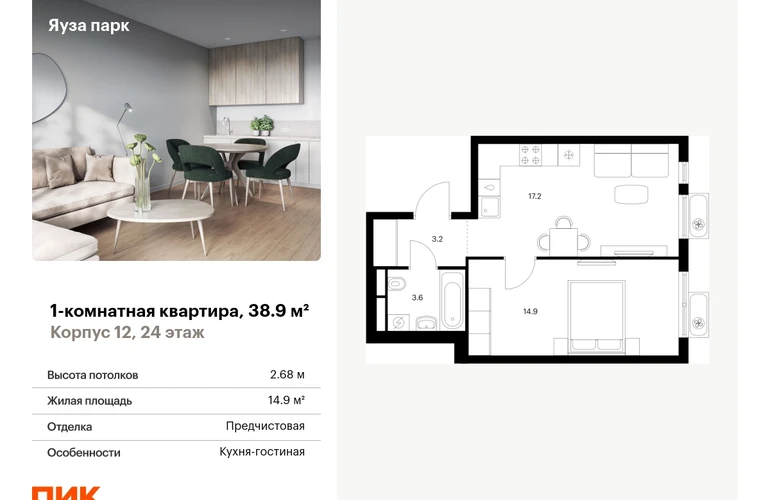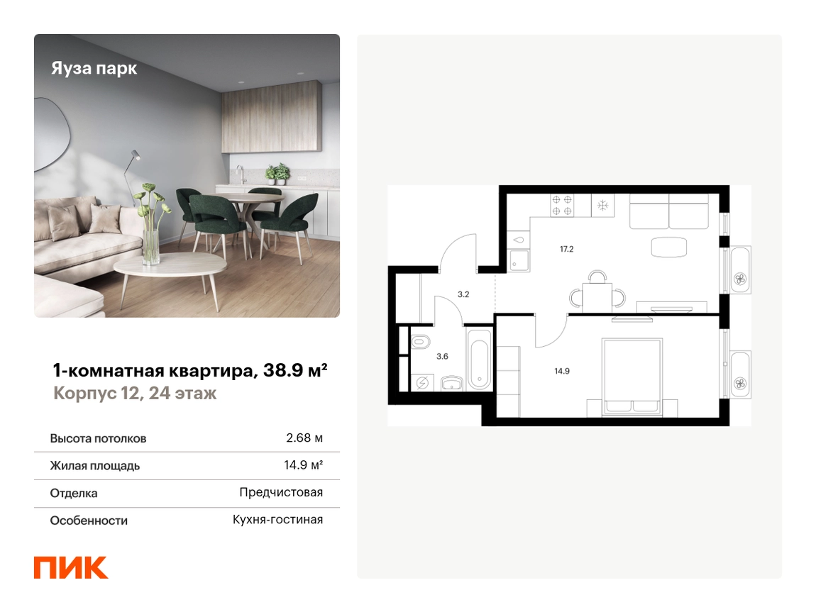 Продаётся 1-комн.квартира площадью 38.90 кв.м на 24 этаже 24 этажного дома (Корпус 12, секция 1) проекта ПИК Яуза парк. Светлый просторный подъезд на уровне земли, функциональная планировка, большие окна, с отделкой. Жилой квартал «Яуза парк» возводится в Мытищах, в 5 минутах ходьбы от одноимённой ж/д станции. Проект включает 20 домов разной этажности с благоустроенными дворами-парками. Индивидуальный дизайн фасадов разработали архитектурные бюро KATARSIS и RHIZOME. Вблизи жилого квартала появятся шумопоглощающие экраны, позволяющие забыть о том, что неподалёку находятся железнодорожные пути. На первых этажах домов откроются магазины, кафе, салоны красоты и другие полезные сервисы. Рядом есть школы и детские сады, магазины и ТРЦ «Красный кит». На территории проекта появится благоустроенная набережная реки Яузы и пешеходный бульвар для прогулок всей семьёй. Водонапорную башню XIX века, расположенную на территории «Яуза парка», мы реставрируем и создадим вокруг неё общественное пространство для отдыха жителей квартала. Для прогулок отлично подойдёт Мытищинский центральный парк культуры и отдыха, расположенный в 10 минутах ходьбы, и Лосиный остров — в 24 минутах. Дорога на автомобиле до Ярославского шоссе займёт не более 3 минут, до МКАД — 10 минут. Артикул - 1000903О застройщике