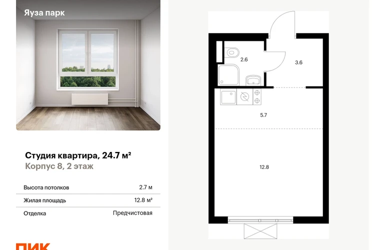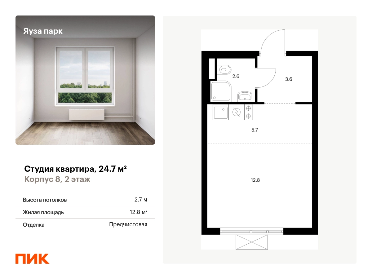 Продаётся квартира-студия площадью 24.70 кв.м на 2 этаже 24 этажного дома (Корпус 8, секция 1) проекта ПИК Яуза парк. Светлый просторный подъезд на уровне земли, функциональная планировка, большие окна, с отделкой. Жилой квартал «Яуза парк» возводится в Мытищах, в 5 минутах ходьбы от одноимённой ж/д станции. Проект включает 20 домов разной этажности с благоустроенными дворами-парками. Индивидуальный дизайн фасадов разработали архитектурные бюро KATARSIS и RHIZOME. Вблизи жилого квартала появятся шумопоглощающие экраны, позволяющие забыть о том, что неподалёку находятся железнодорожные пути. На первых этажах домов откроются магазины, кафе, салоны красоты и другие полезные сервисы. Рядом есть школы и детские сады, магазины и ТРЦ «Красный кит». На территории проекта появится благоустроенная набережная реки Яузы и пешеходный бульвар для прогулок всей семьёй. Водонапорную башню XIX века, расположенную на территории «Яуза парка», мы реставрируем и создадим вокруг неё общественное пространство для отдыха жителей квартала. Для прогулок отлично подойдёт Мытищинский центральный парк культуры и отдыха, расположенный в 10 минутах ходьбы, и Лосиный остров — в 24 минутах. Дорога на автомобиле до Ярославского шоссе займёт не более 3 минут, до МКАД — 10 минут. Артикул - 996857О застройщике