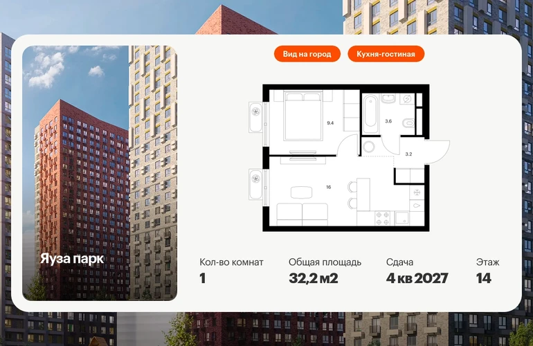 Продаётся 1-комн.квартира площадью 32.20 кв.м на 14 этаже 24 этажного дома (Корпус 12, секция 1) проекта ПИК Яуза парк. Светлый просторный подъезд на уровне земли, функциональная планировка, большие окна, с отделкой. Жилой квартал «Яуза парк» возводится в Мытищах, в 5 минутах ходьбы от одноимённой ж/д станции. Проект включает 20 домов разной этажности с благоустроенными дворами-парками. Индивидуальный дизайн фасадов разработали архитектурные бюро KATARSIS и RHIZOME. Вблизи жилого квартала появятся шумопоглощающие экраны, позволяющие забыть о том, что неподалёку находятся железнодорожные пути. На первых этажах домов откроются магазины, кафе, салоны красоты и другие полезные сервисы. Рядом есть школы и детские сады, магазины и ТРЦ «Красный кит». На территории проекта появится благоустроенная набережная реки Яузы и пешеходный бульвар для прогулок всей семьёй. Водонапорную башню XIX века, расположенную на территории «Яуза парка», мы реставрируем и создадим вокруг неё общественное пространство для отдыха жителей квартала. Для прогулок отлично подойдёт Мытищинский центральный парк культуры и отдыха, расположенный в 10 минутах ходьбы, и Лосиный остров — в 24 минутах. Дорога на автомобиле до Ярославского шоссе займёт не более 3 минут, до МКАД — 10 минут. Артикул - 1000766О застройщике