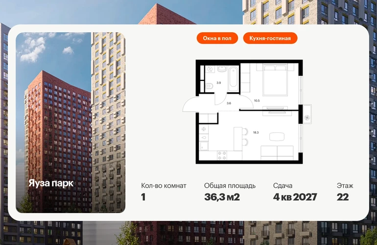 Продаётся 1-комн.квартира площадью 36.30 кв.м на 22 этаже 24 этажного дома (Корпус 12, секция 1) проекта ПИК Яуза парк. Светлый просторный подъезд на уровне земли, функциональная планировка, большие окна, с отделкой. Жилой квартал «Яуза парк» возводится в Мытищах, в 5 минутах ходьбы от одноимённой ж/д станции. Проект включает 20 домов разной этажности с благоустроенными дворами-парками. Индивидуальный дизайн фасадов разработали архитектурные бюро KATARSIS и RHIZOME. Вблизи жилого квартала появятся шумопоглощающие экраны, позволяющие забыть о том, что неподалёку находятся железнодорожные пути. На первых этажах домов откроются магазины, кафе, салоны красоты и другие полезные сервисы. Рядом есть школы и детские сады, магазины и ТРЦ «Красный кит». На территории проекта появится благоустроенная набережная реки Яузы и пешеходный бульвар для прогулок всей семьёй. Водонапорную башню XIX века, расположенную на территории «Яуза парка», мы реставрируем и создадим вокруг неё общественное пространство для отдыха жителей квартала. Для прогулок отлично подойдёт Мытищинский центральный парк культуры и отдыха, расположенный в 10 минутах ходьбы, и Лосиный остров — в 24 минутах. Дорога на автомобиле до Ярославского шоссе займёт не более 3 минут, до МКАД — 10 минут. Артикул - 1000874О застройщике