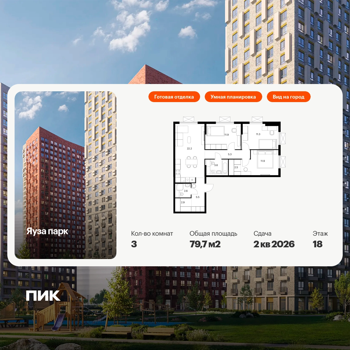 Продаётся 3-комн.квартира площадью 79.70 кв.м на 18 этаже 24 этажного дома (Корпус 6, секция 1) проекта ПИК Яуза парк. Светлый просторный подъезд на уровне земли, функциональная планировка, большие окна, с отделкой. Жилой квартал «Яуза парк» возводится в Мытищах, в 5 минутах ходьбы от одноимённой ж/д станции. Проект включает 20 домов разной этажности с благоустроенными дворами-парками. Индивидуальный дизайн фасадов разработали архитектурные бюро KATARSIS и RHIZOME. Вблизи жилого квартала появятся шумопоглощающие экраны, позволяющие забыть о том, что неподалёку находятся железнодорожные пути. На первых этажах домов откроются магазины, кафе, салоны красоты и другие полезные сервисы. Рядом есть школы и детские сады, магазины и ТРЦ «Красный кит». На территории проекта появится благоустроенная набережная реки Яузы и пешеходный бульвар для прогулок всей семьёй. Водонапорную башню XIX века, расположенную на территории «Яуза парка», мы реставрируем и создадим вокруг неё общественное пространство для отдыха жителей квартала. Для прогулок отлично подойдёт Мытищинский центральный парк культуры и отдыха, расположенный в 10 минутах ходьбы, и Лосиный остров — в 24 минутах. Дорога на автомобиле до Ярославского шоссе займёт не более 3 минут, до МКАД — 10 минут. Артикул - 940914О застройщике