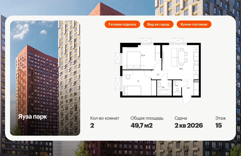 Продаётся 2-комн.квартира площадью 49.70 кв.м на 15 этаже 24 этажного дома (Корпус 6, секция 1) проекта ПИК Яуза парк. Светлый просторный подъезд на уровне земли, функциональная планировка, большие окна, с отделкой. Жилой квартал «Яуза парк» возводится в Мытищах, в 5 минутах ходьбы от одноимённой ж/д станции. Проект включает 20 домов разной этажности с благоустроенными дворами-парками. Индивидуальный дизайн фасадов разработали архитектурные бюро KATARSIS и RHIZOME. Вблизи жилого квартала появятся шумопоглощающие экраны, позволяющие забыть о том, что неподалёку находятся железнодорожные пути. На первых этажах домов откроются магазины, кафе, салоны красоты и другие полезные сервисы. Рядом есть школы и детские сады, магазины и ТРЦ «Красный кит». На территории проекта появится благоустроенная набережная реки Яузы и пешеходный бульвар для прогулок всей семьёй. Водонапорную башню XIX века, расположенную на территории «Яуза парка», мы реставрируем и создадим вокруг неё общественное пространство для отдыха жителей квартала. Для прогулок отлично подойдёт Мытищинский центральный парк культуры и отдыха, расположенный в 10 минутах ходьбы, и Лосиный остров — в 24 минутах. Дорога на автомобиле до Ярославского шоссе займёт не более 3 минут, до МКАД — 10 минут. Артикул - 940865О застройщике