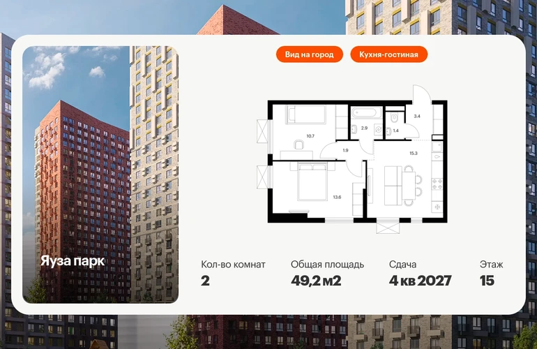 Продаётся 2-комн.квартира площадью 49.20 кв.м на 15 этаже 24 этажного дома (Корпус 10, секция 1) проекта ПИК Яуза парк. Светлый просторный подъезд на уровне земли, функциональная планировка, большие окна, с отделкой. Жилой квартал «Яуза парк» возводится в Мытищах, в 5 минутах ходьбы от одноимённой ж/д станции. Проект включает 20 домов разной этажности с благоустроенными дворами-парками. Индивидуальный дизайн фасадов разработали архитектурные бюро KATARSIS и RHIZOME. Вблизи жилого квартала появятся шумопоглощающие экраны, позволяющие забыть о том, что неподалёку находятся железнодорожные пути. На первых этажах домов откроются магазины, кафе, салоны красоты и другие полезные сервисы. Рядом есть школы и детские сады, магазины и ТРЦ «Красный кит». На территории проекта появится благоустроенная набережная реки Яузы и пешеходный бульвар для прогулок всей семьёй. Водонапорную башню XIX века, расположенную на территории «Яуза парка», мы реставрируем и создадим вокруг неё общественное пространство для отдыха жителей квартала. Для прогулок отлично подойдёт Мытищинский центральный парк культуры и отдыха, расположенный в 10 минутах ходьбы, и Лосиный остров — в 24 минутах. Дорога на автомобиле до Ярославского шоссе займёт не более 3 минут, до МКАД — 10 минут. Артикул - 999407О застройщике