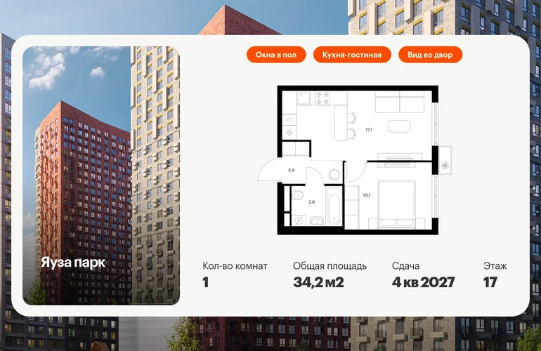 Продаётся 1-комн.квартира площадью 34.20 кв.м на 17 этаже 24 этажного дома (Корпус 12, секция 1) проекта ПИК Яуза парк. Светлый просторный подъезд на уровне земли, функциональная планировка, большие окна, с отделкой. Жилой квартал «Яуза парк» возводится в Мытищах, в 5 минутах ходьбы от одноимённой ж/д станции. Проект включает 20 домов разной этажности с благоустроенными дворами-парками. Индивидуальный дизайн фасадов разработали архитектурные бюро KATARSIS и RHIZOME. Вблизи жилого квартала появятся шумопоглощающие экраны, позволяющие забыть о том, что неподалёку находятся железнодорожные пути. На первых этажах домов откроются магазины, кафе, салоны красоты и другие полезные сервисы. Рядом есть школы и детские сады, магазины и ТРЦ «Красный кит». На территории проекта появится благоустроенная набережная реки Яузы и пешеходный бульвар для прогулок всей семьёй. Водонапорную башню XIX века, расположенную на территории «Яуза парка», мы реставрируем и создадим вокруг неё общественное пространство для отдыха жителей квартала. Для прогулок отлично подойдёт Мытищинский центральный парк культуры и отдыха, расположенный в 10 минутах ходьбы, и Лосиный остров — в 24 минутах. Дорога на автомобиле до Ярославского шоссе займёт не более 3 минут, до МКАД — 10 минут. Артикул - 1000809О застройщике